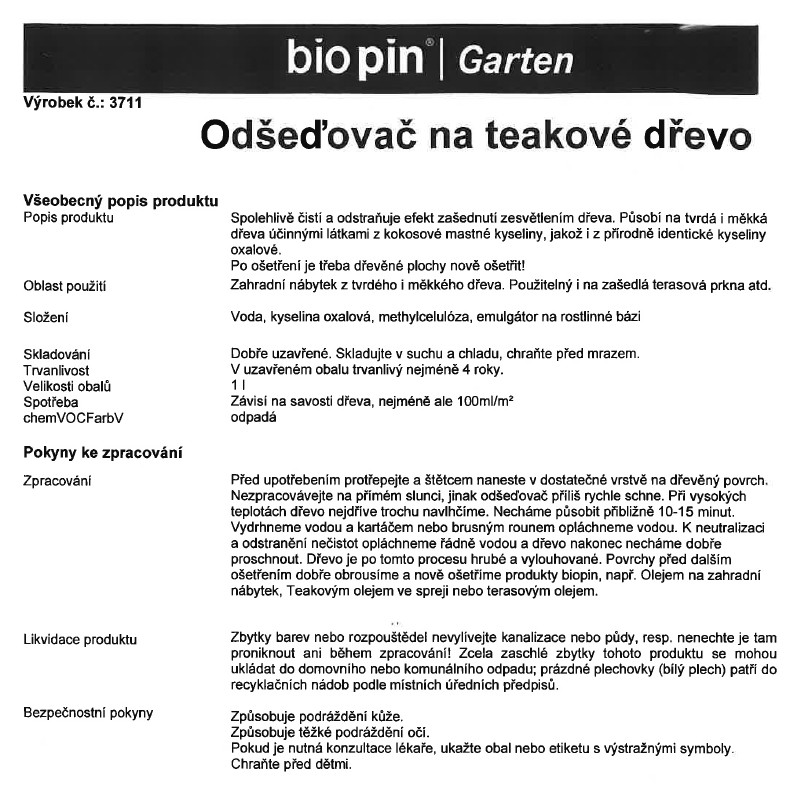 Silny rozjaśniacz do twardego i miękkiego drewna, do dokładnego zszarzenia patyny spowodowanej wietrzeniem wszystkich twardych gatunków drewna, takich jak stoły czy krzesła ogrodowe. Nakładać pędzlem, pozostawić do działania i zmyć gąbką i wodą. Można go również stosować na szarych deskach tarasowych itp.