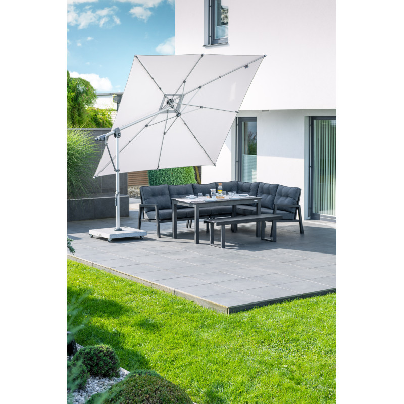 Active 350 x 260 cm to bardzo wszechstronny i wysokiej jakości parasol z solidną aluminiową ramą. Prostokątny kształt dachu jest szczególnie odpowiedni do zacieniania mebli ogrodowych. Ponadto parasol można dostosować do ruchu słońca w ciągu dnia, ponieważ można go obracać o 360 °, obracać osiowo w obie strony i ustawiać pod kątem do tyłu, optymalnie...