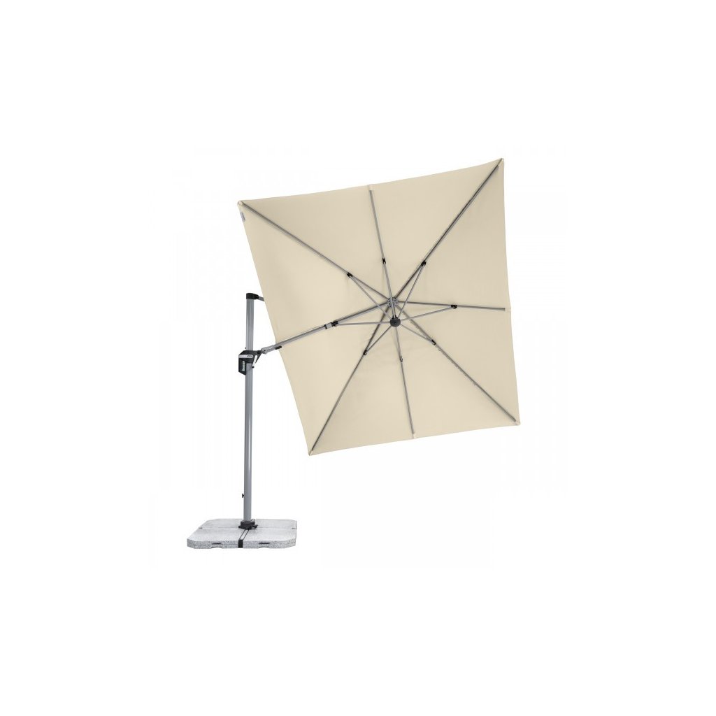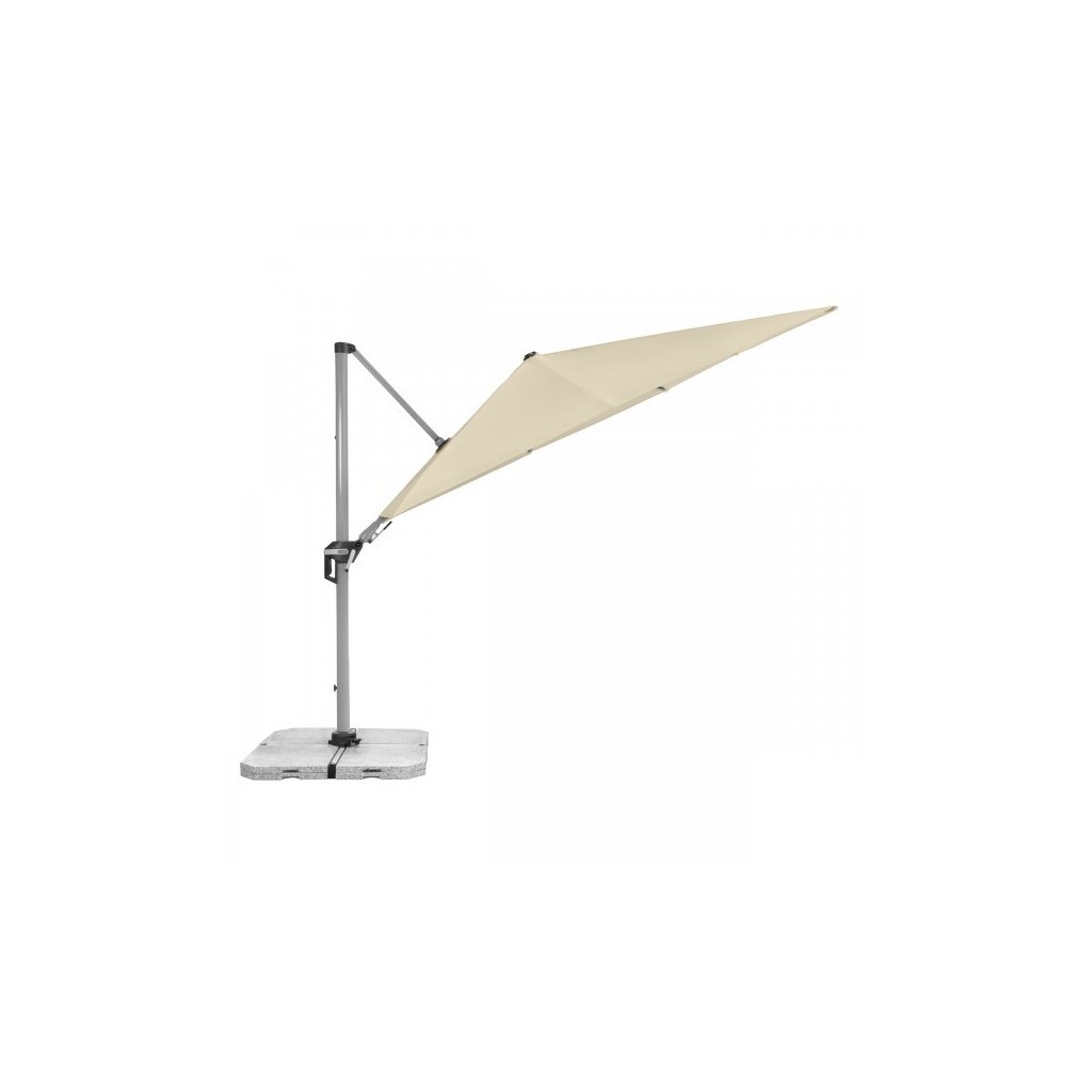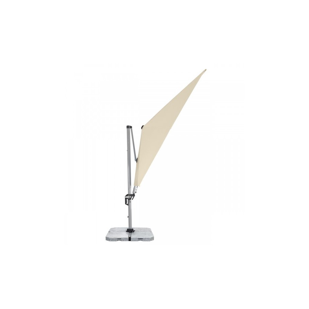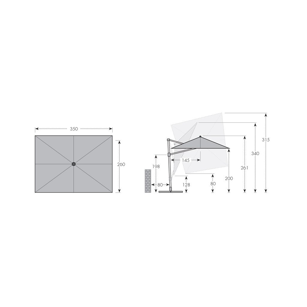 Active 350 x 260 cm to bardzo wszechstronny i wysokiej jakości parasol z solidną aluminiową ramą. Prostokątny kształt czaszy jest szczególnie odpowiedni do zacienienia mebli ogrodowych. Ponadto parasol można dopasować do ruchu słońca w ciągu dnia, ponieważ można go obracać o 360°, obracać osiowo w obie strony i ustawiać pod kątem do tyłu, dzięki czemu optymalnie dopasowuje się do ruchu słońca. Pokrycie wykonane jest z wodoodpornej tkaniny poliestrowej z dobrą ochroną UV 50+.