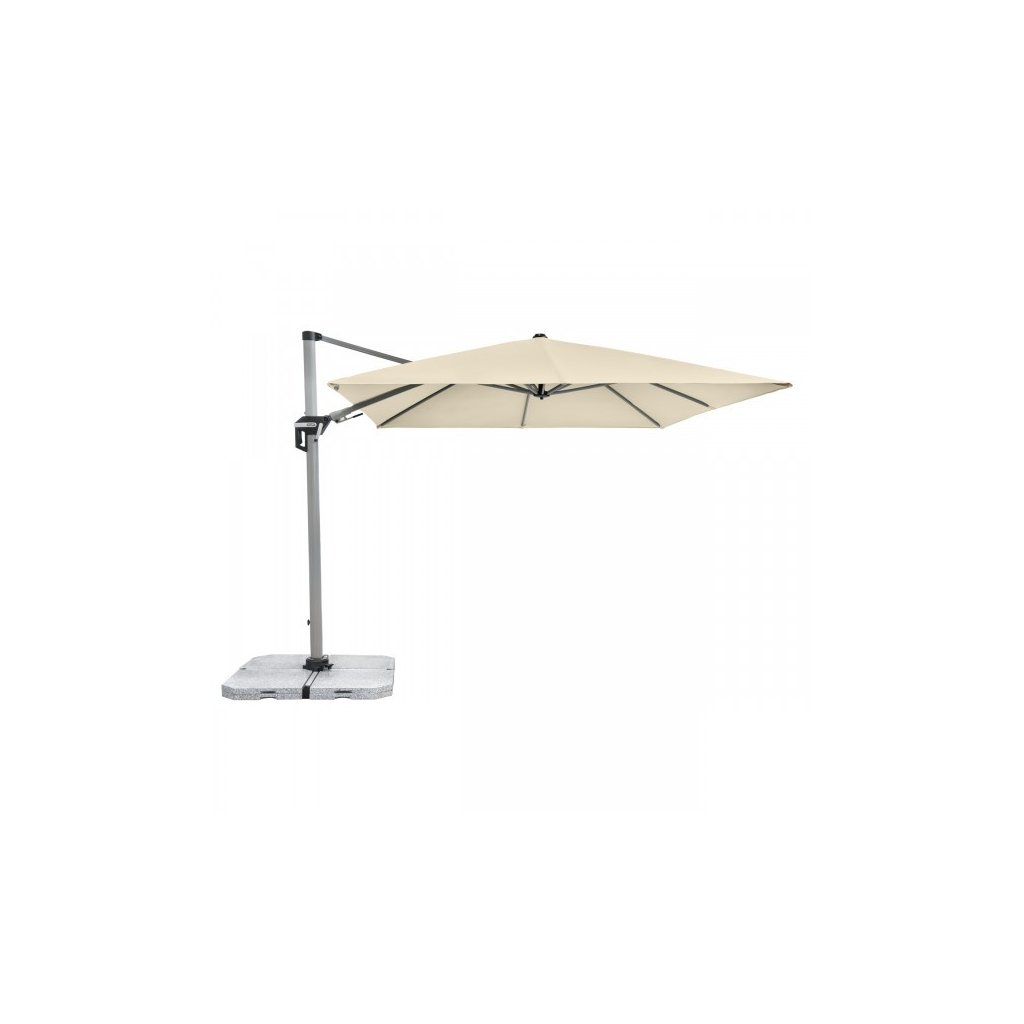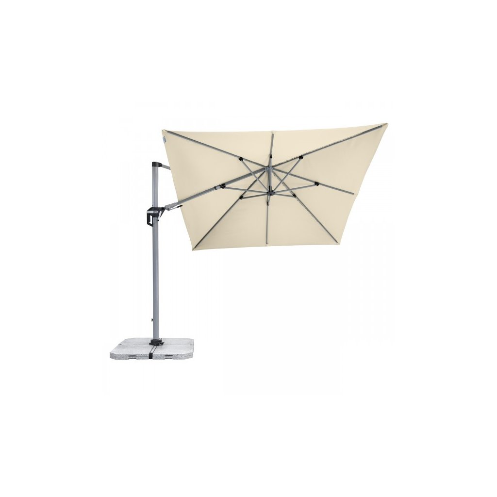 Active 350 x 260 cm to bardzo wszechstronny i wysokiej jakości parasol z solidną aluminiową ramą. Prostokątny kształt czaszy jest szczególnie odpowiedni do zacienienia mebli ogrodowych. Ponadto parasol można dopasować do ruchu słońca w ciągu dnia, ponieważ można go obracać o 360°, obracać osiowo w obie strony i ustawiać pod kątem do tyłu, dzięki czemu optymalnie dopasowuje się do ruchu słońca. Pokrycie wykonane jest z wodoodpornej tkaniny poliestrowej z dobrą ochroną UV 50+.