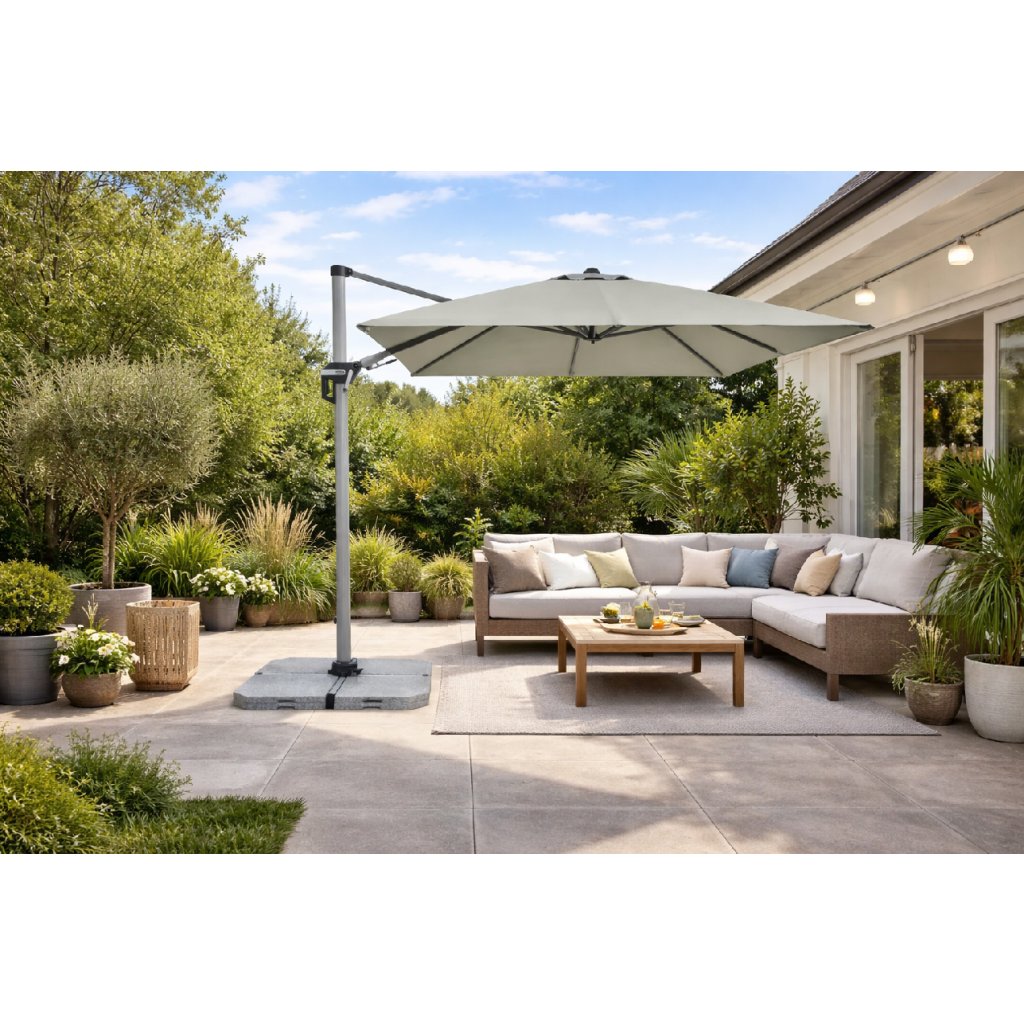 Active 350 x 260 cm to bardzo wszechstronny i wysokiej jakości parasol z solidną aluminiową ramą. Prostokątny kształt czaszy jest szczególnie odpowiedni do zacienienia mebli ogrodowych. Ponadto parasol można dopasować do ruchu słońca w ciągu dnia, ponieważ można go obracać o 360°, obracać osiowo w obie strony i ustawiać pod kątem do tyłu, dzięki czemu optymalnie dopasowuje się do ruchu słońca. Pokrycie wykonane jest z wodoodpornej tkaniny poliestrowej z dobrą ochroną UV 50+.