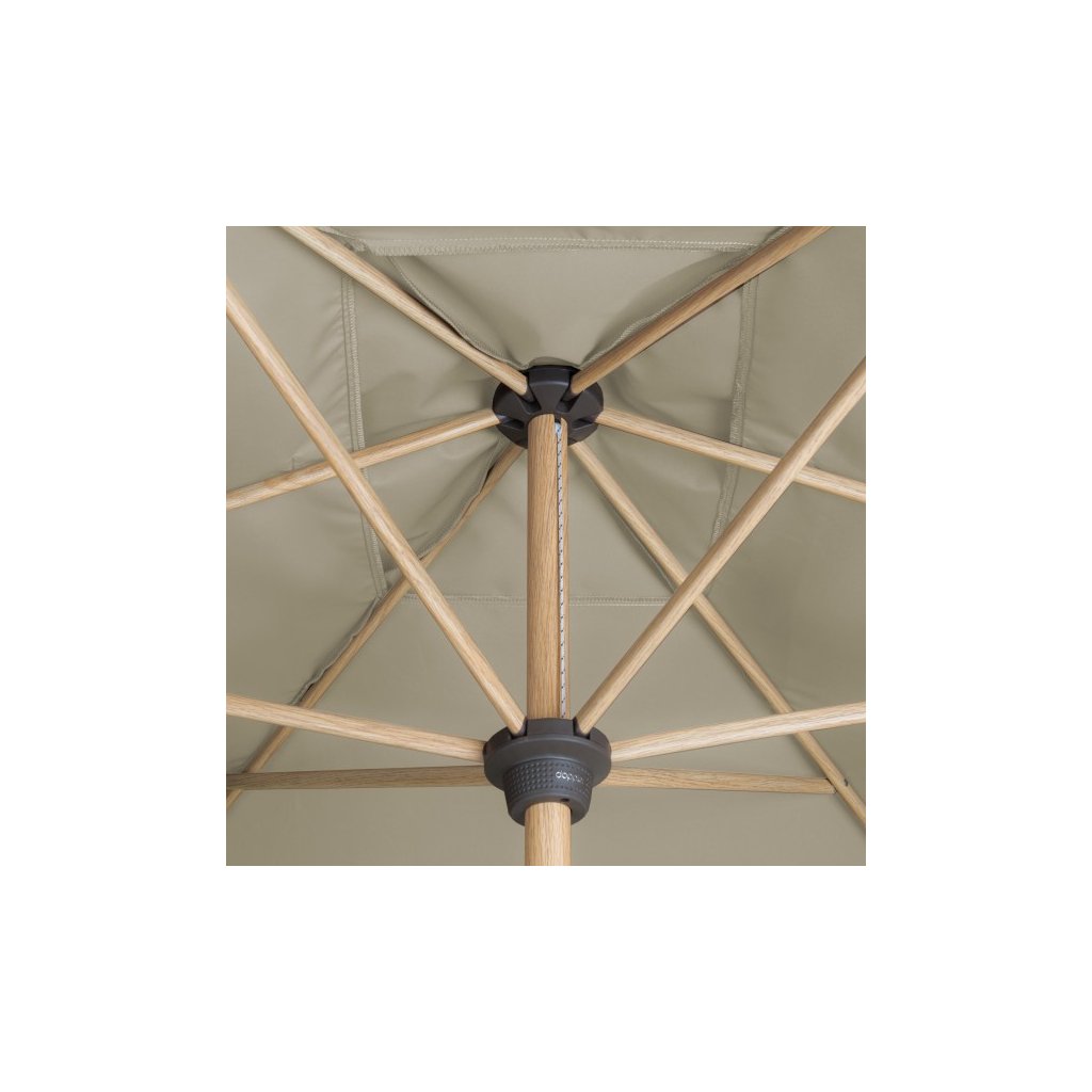 Ten parasol ucieszy miłośników drewna. Dzięki ponadczasowemu wyglądowi imitującemu drewno jesionowe i poszyciom w ciepłych, naturalnych kolorach, pasuje niemal na każdy balkon, taras lub do ogrodu. Parasol oferuje przyjazną dla użytkownika obsługę za pomocą korbki. Posiada możliwość pochylenia do 3 pozycji. Stelaż parasola wykonany jest z wysokiej jakości aluminium, a wsporniki ze stali, co zapewnia długą żywotność. Pokrowiec zapewnia doskonałą ochronę przed promieniowaniem UV 80+. Dzięki otworowi wentylacyjnemu w dachu, pod parasolem nie gromadzi się gorące letnie powietrze.