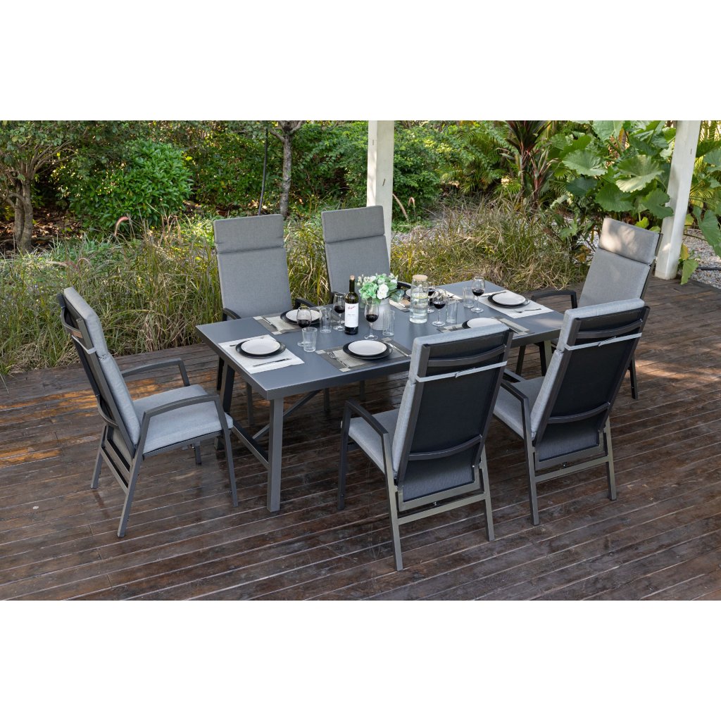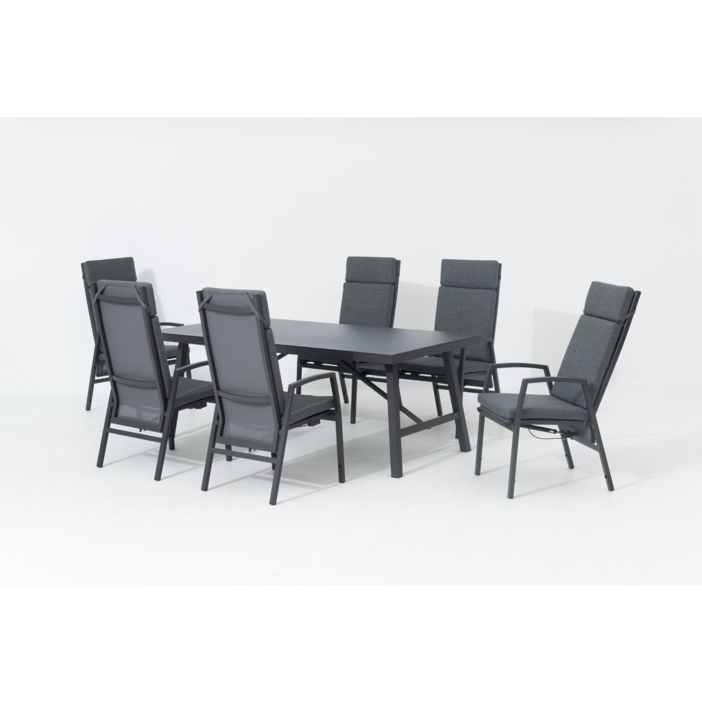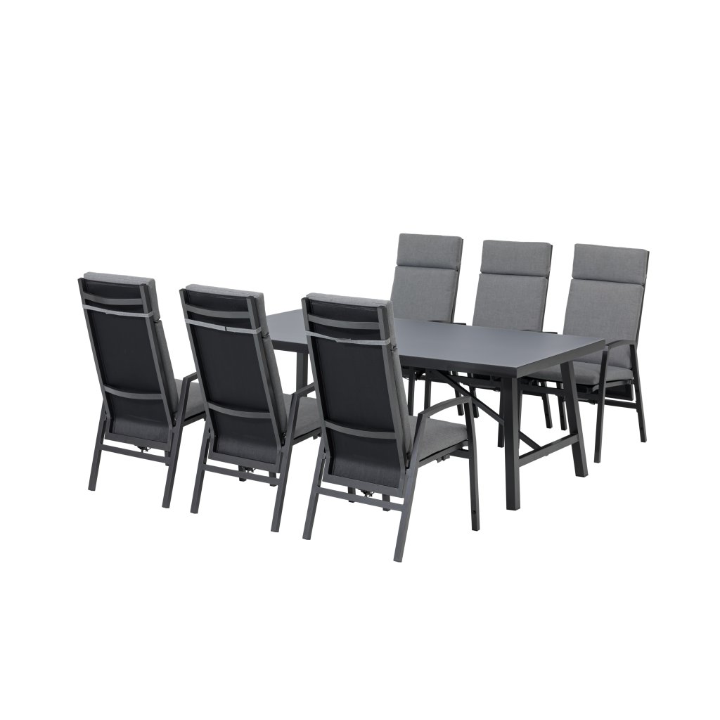 Ten 7-elementowy zestaw wykonany jest z lekkiej i wytrzymałej aluminiowej konstrukcji w nowoczesnym kolorze antracytowym, która jest łatwa w utrzymaniu i doskonale odporna na warunki atmosferyczne.
