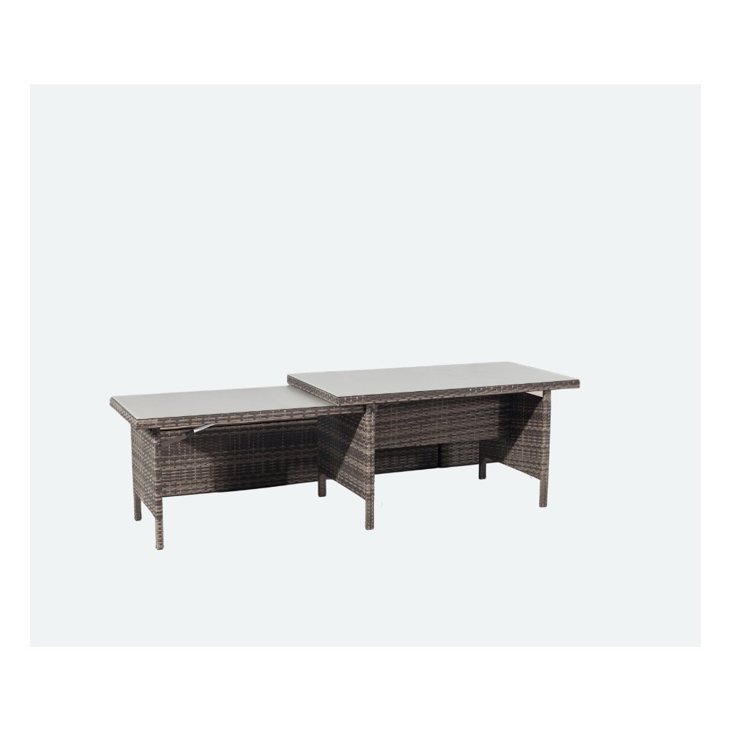 Stół posiada stabilną konstrukcję ze stali ocynkowanej, oplecioną sztucznym rattanem, który jest nie tylko piękny, ale także praktycznie bezobsługowy. Stół posiada blat z bezpiecznego szkła strukturalnego. Stół można rozłożyć, dzięki czemu pomieści nawet liczną rodzinę. Dzięki wysokości stołu 72 cm, zestaw jest odpowiedni do spożywania posiłków, co czyni go idealnym dla każdego, kto szuka kompromisu między relaksującym siedzeniem a zestawem jadalnianym.