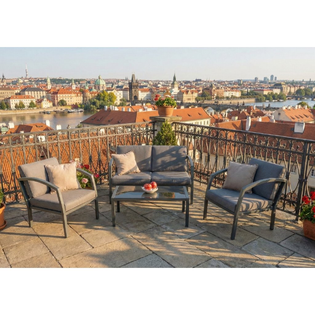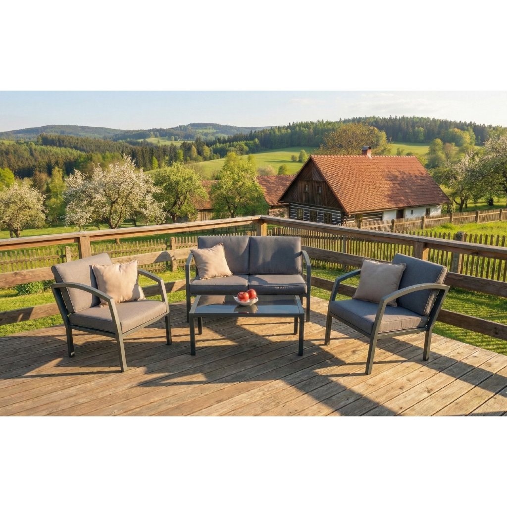 Wysokiej jakości i stabilna aluminiowa konstrukcja w kolorze antracytowym jest połączona z wytrzymałymi poliestrowymi siedziskami i puszystymi poduszkami oparciowymi, które zapewniają maksymalny komfort. Poduszki są wyposażone w zamki błyskawiczne, co pozwala na ich łatwe wyjęcie i wypranie. Zestaw składa się z dwuosobowej sofy, dwóch foteli i stolika ze szklanym blatem.