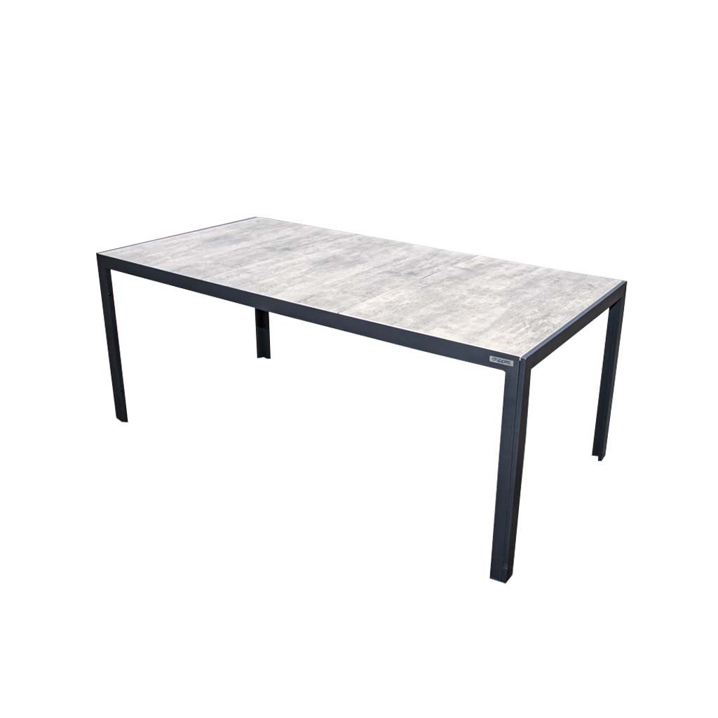 BERGAMO to nowoczesny stół o wymiarach około 180 x 90 cm ze stabilną aluminiową konstrukcją, która jest pokryta proszkowo w kolorze antracytowym. Dzięki temu metal jest chroniony przed korozją i warunkami atmosferycznymi, co czyni go meblem ogrodowym o długiej żywotności.