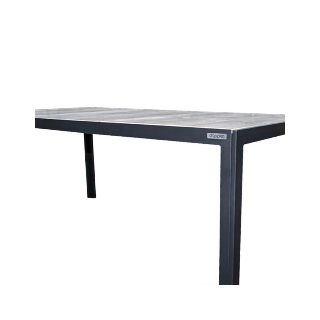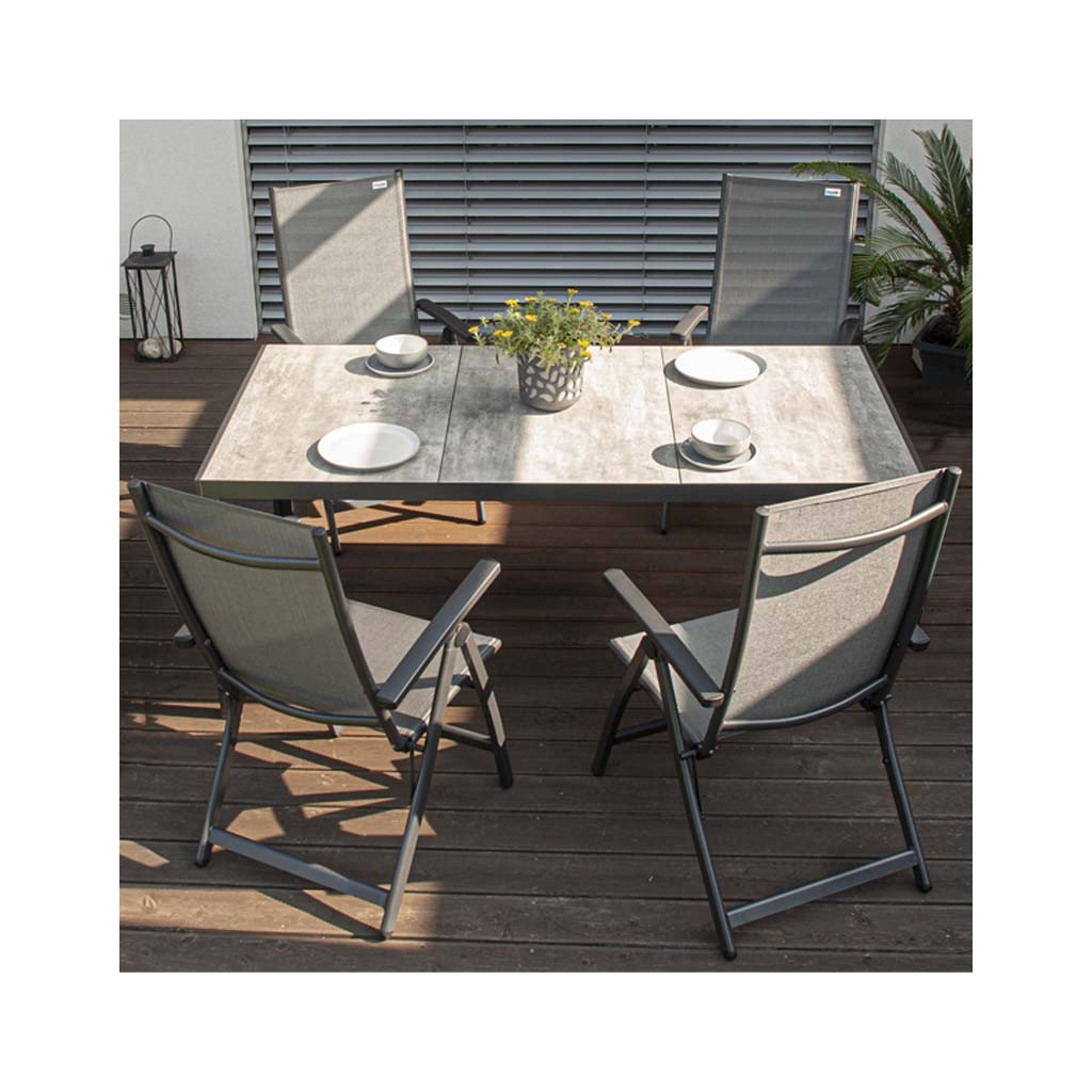 Fotele uzupełnia stół Bergamo o wymiarach 180 x 90 cm. Stół posiada wytrzymałą aluminiową konstrukcję malowaną proszkowo na kolor antracytowy, która chroni stół przed korozją i znacznie przedłuża jego żywotność. Dużą zaletą stołu jest również jego wytrzymały ceramiczny blat w pięknym, melanżowym szarym kolorze.