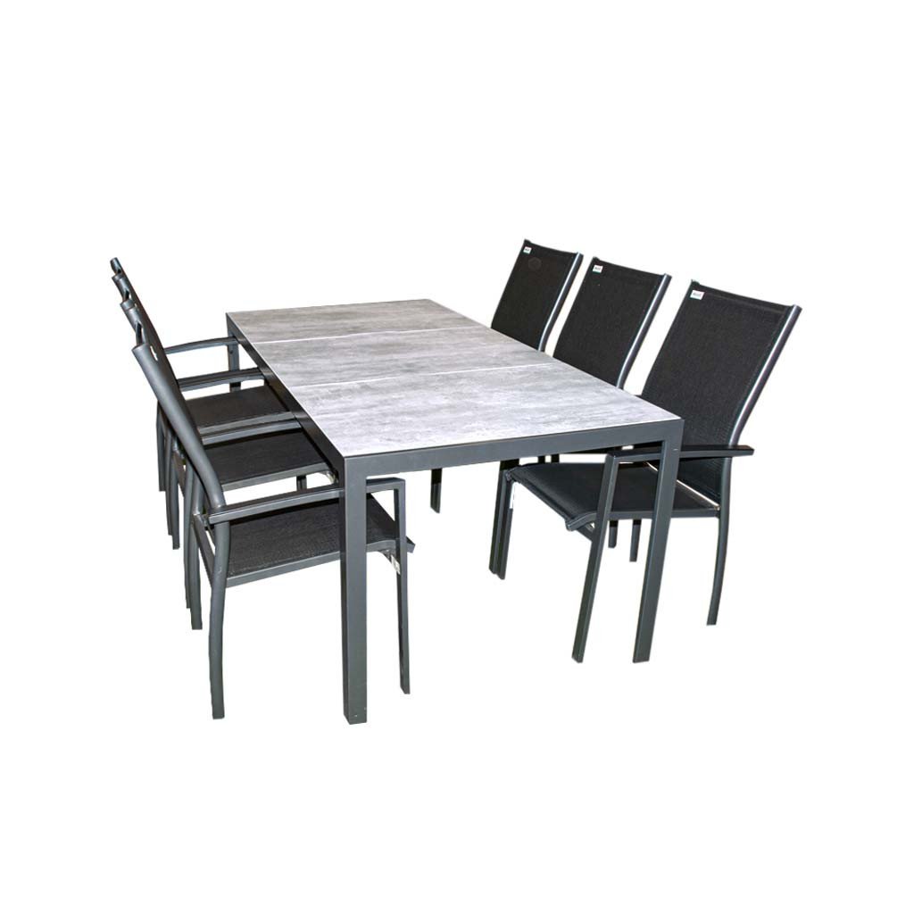 Konstrukcja stołu wykonana jest z aluminium, pokrytego proszkowo w kolorze antracytowym, co chroni stół przed korozją i znacznie przedłuża jego żywotność. Dużą zaletą stołu jest również jego wytrzymały ceramiczny blat w pięknym, melanżowym szarym kolorze.