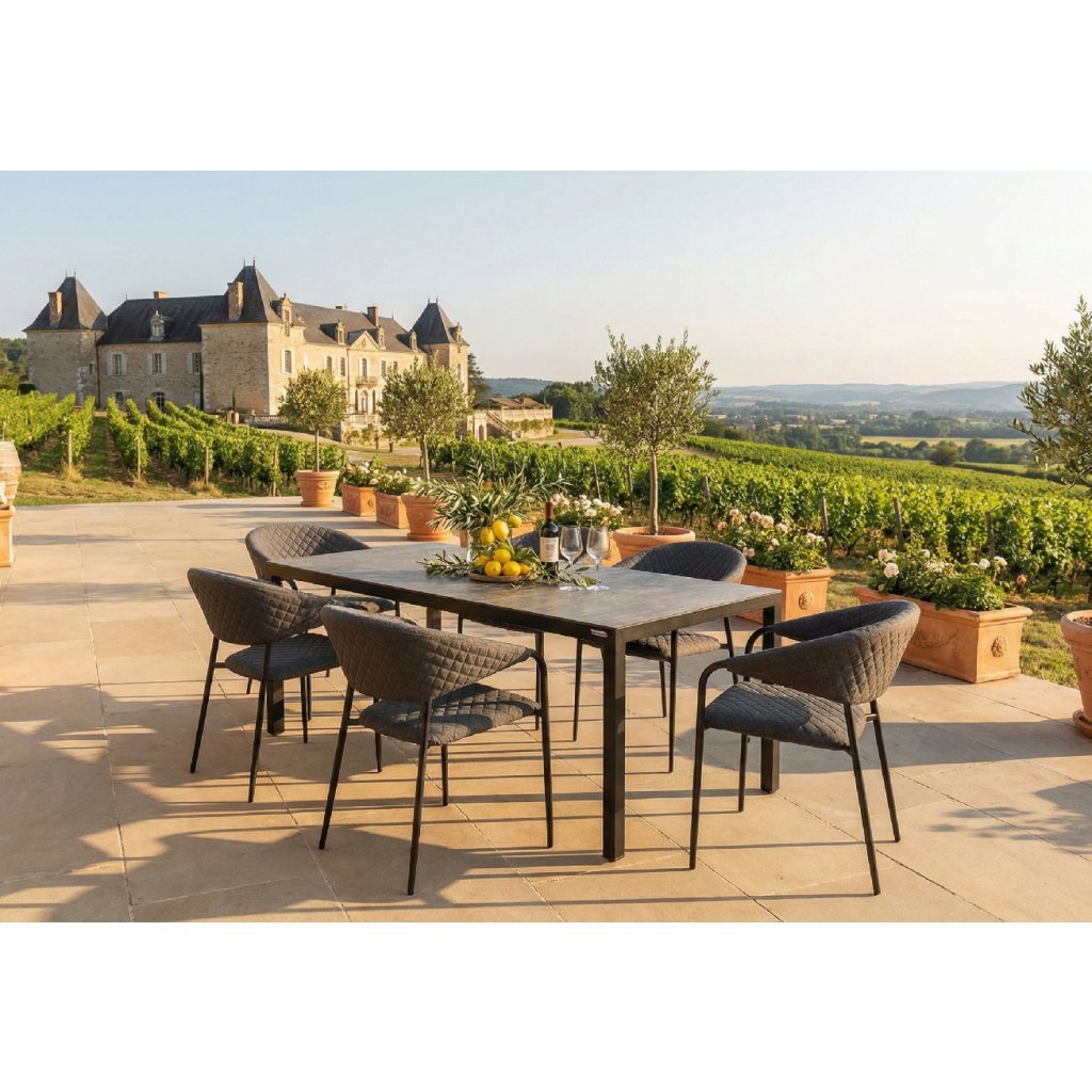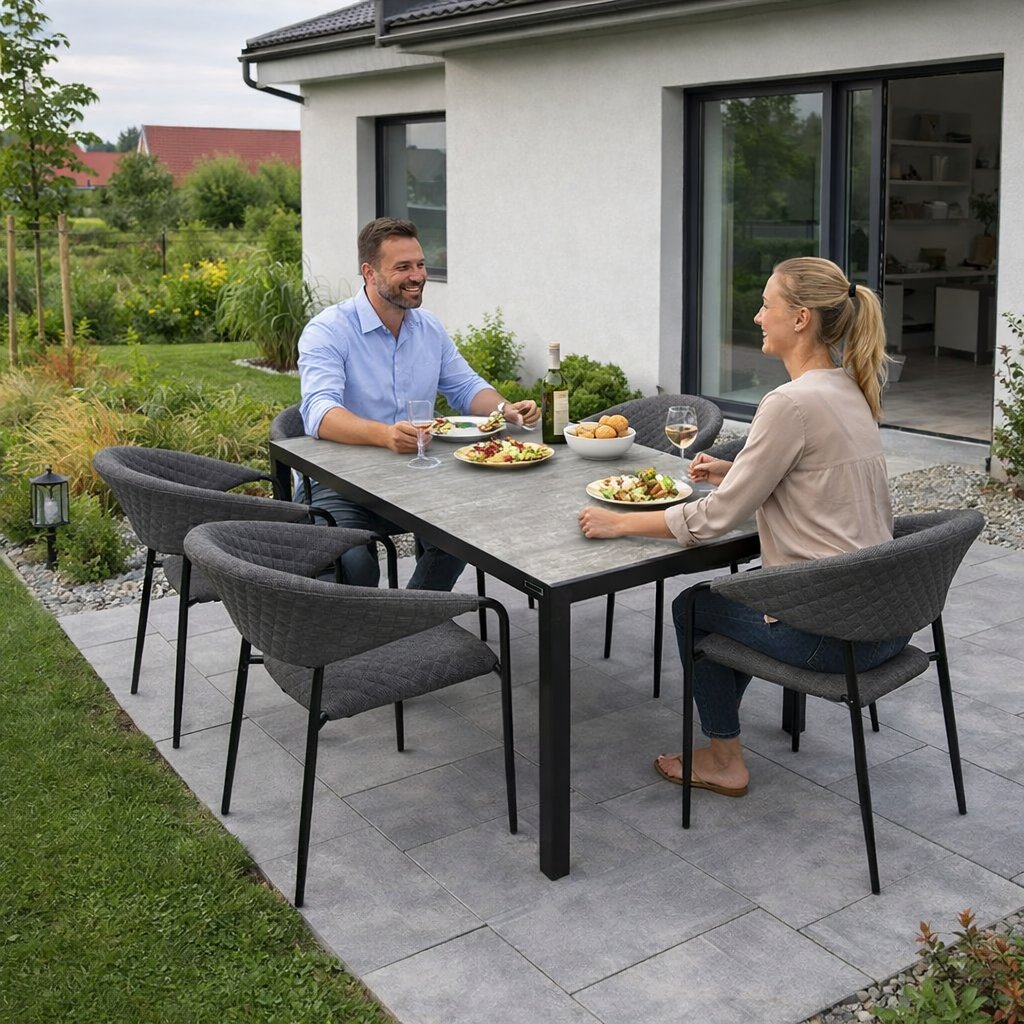 BERGAMO to nowoczesny stół o wymiarach około 180 x 90 cm ze stabilną aluminiową konstrukcją, która jest pokryta proszkowo w kolorze antracytowym. Dzięki temu metal jest chroniony przed korozją i warunkami atmosferycznymi, stając się meblem ogrodowym o długiej żywotności. Dużą zaletą jest ceramiczny blat w kolorze przydymionego szarego. Dzięki temu stół jest prawie bezobsługowy i odporny na warunki atmosferyczne. Prosty design w neutralnych kolorach można uzupełnić pasującymi krzesłami i akcesoriami marki DOPPLER.
