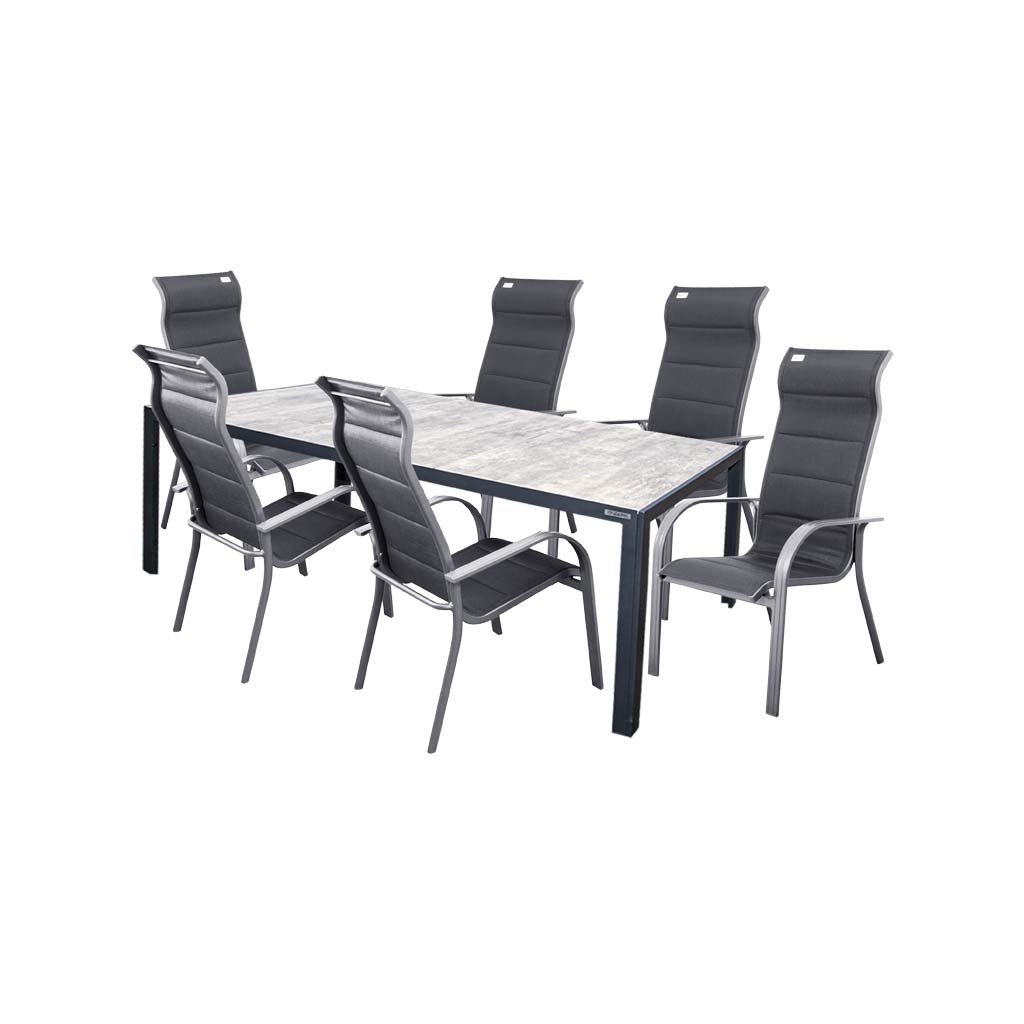 Zestaw zawiera również stół Bergamo o wymiarach 180x90 cm. Stół posiada wytrzymałą aluminiową konstrukcję pokrytą proszkowo w kolorze antracytowym, która chroni stół przed korozją i znacznie wydłuża jego żywotność. Dużą zaletą stołu jest również jego wytrzymały ceramiczny blat w pięknym, melanżowym szarym kolorze.