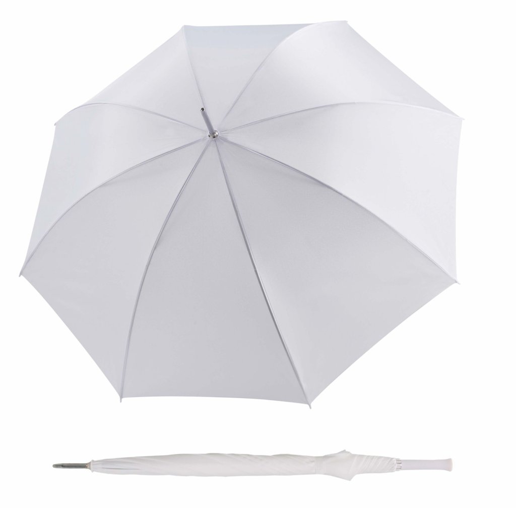Partnerski parasol ślubny, praktyczne wykonanie dla dwojga. Solidna, wytrzymała konstrukcja ze stali, przyjemna w dotyku. Solidna konstrukcja odporna na wiatr. Duża czasza. Poliestrowa poszycie jest odporne na zmiany wilgotności i temperatury, nie kurczy się.