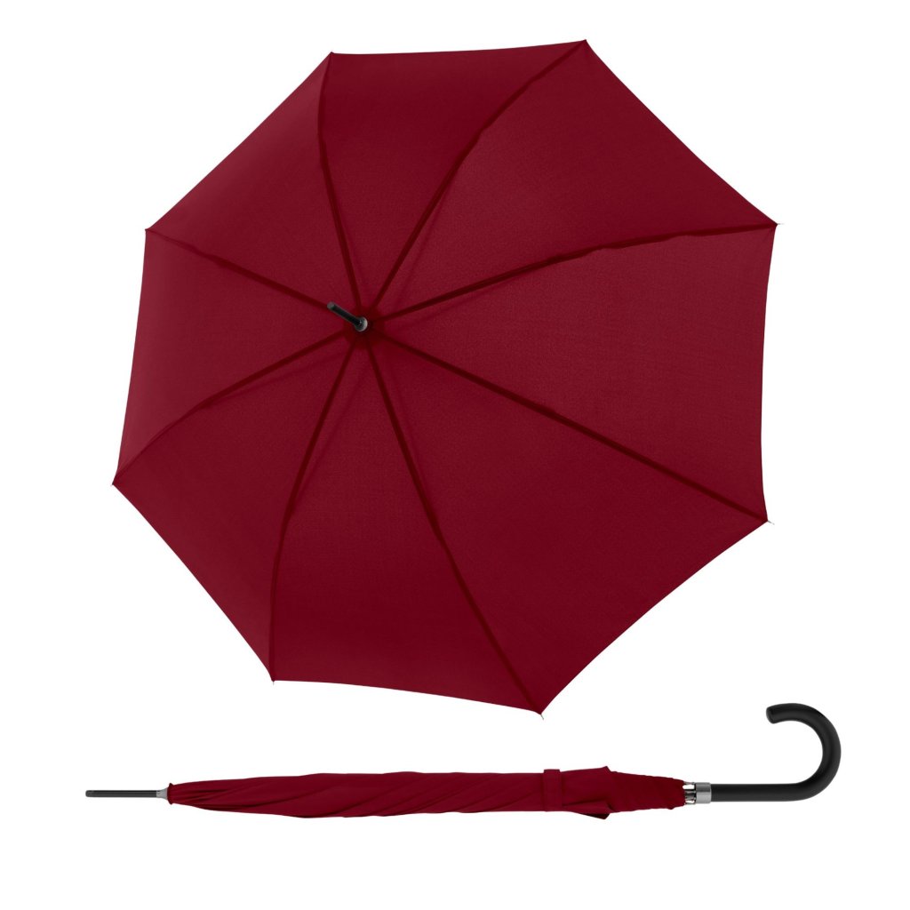 Automatyczny parasol typu "kij" z jednokolorowym wzorem. Ma bardzo szeroki dach, dzięki czemu dwie osoby mogą schronić się pod nim przed deszczem. Plastowy uchwyt świetnie leży w dłoni i jest dodatkowo dopasowany kolorystycznie do reszty parasola. Pozostała część konstrukcji wykonana jest ze stali i włókna szklanego. Ta kombinacja materiałów wraz z wysoką jakością wykonania parasola gwarantuje wysoką wytrzymałość i elastyczność, dzięki czemu nie ulegnie uszkodzeniu, nawet jeśli zostanie przewrócony przez wiatr. Pokrowiec wykonany jest z szybkoschnącego poliestru, który jest odporny na zmiany wilgotności i temperatury, nie kurczy się.