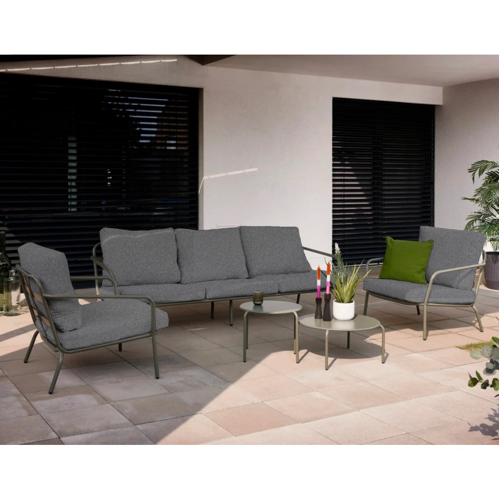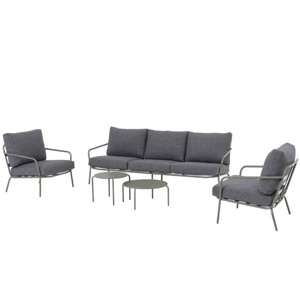 Zestaw wypoczynkowy Calista od razu przyciąga wzrok swoim stylowym wyglądem. Ten zestaw dla 5 osób ma stalową konstrukcję w kolorze ciemnej zieleni. Wygodne siedzenie gwarantują poduszki siedziska i oparcia z bardzo wysokiej jakości tkaniny zewnętrznej w odcieniu szarego melanżu. Zestaw składa się z 3-osobowej sofy, dwóch foteli i dwóch stolików.