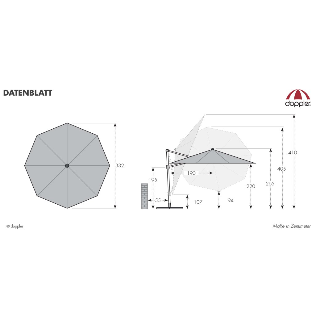 | Cechy i funkcje: | Odporny na warunki atmosferyczne, Obrót wokół osi, Pochylanie, Zdejmowany/ręcznie zmywalny pokrowiec na parasol, Automatyczne otwieranie za pomocą klamki |
