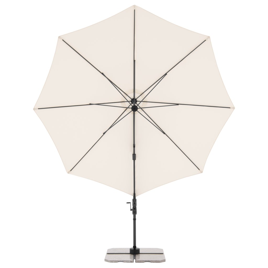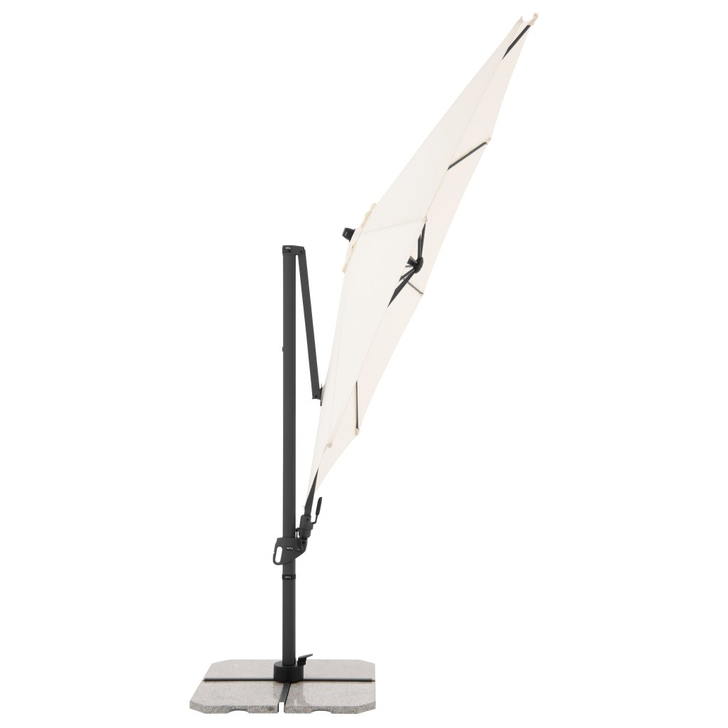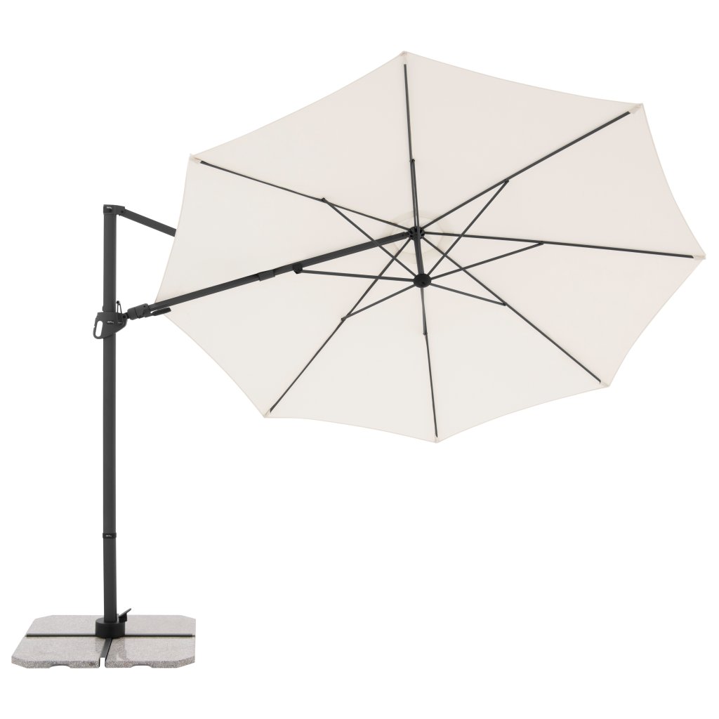 Parasol ma stabilną aluminiową konstrukcję, wyposażony jest w mechanizm korbowy i jest łatwy w obsłudze. Pokrycie parasola wykonane jest z tkaniny poliestrowej, jest wodoodporne i posiada dobrą ochronę UV SPF 50+. Parasol obraca się o 360°, można go pochylać w siedmiu pozycjach i obracać osiowo w obie strony.