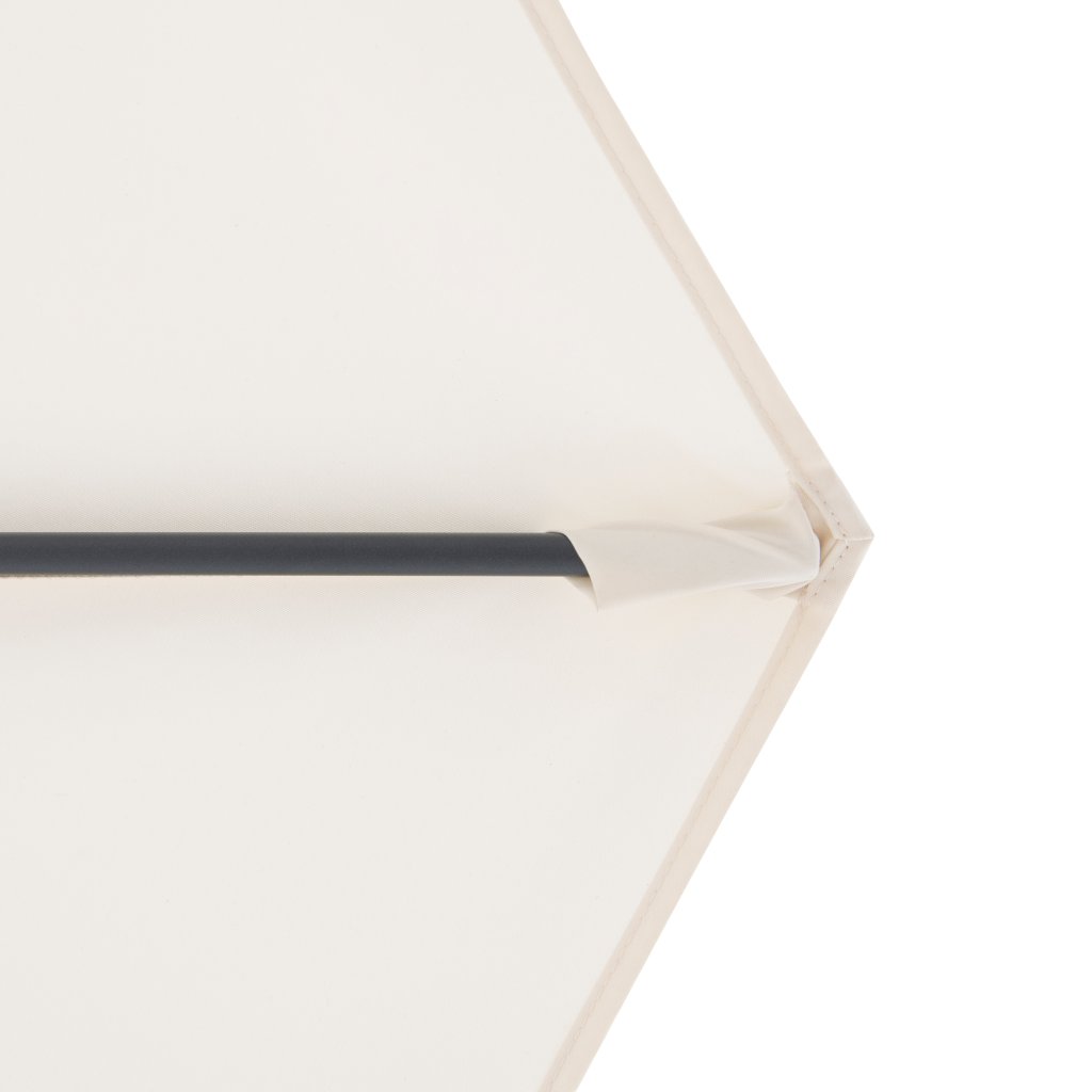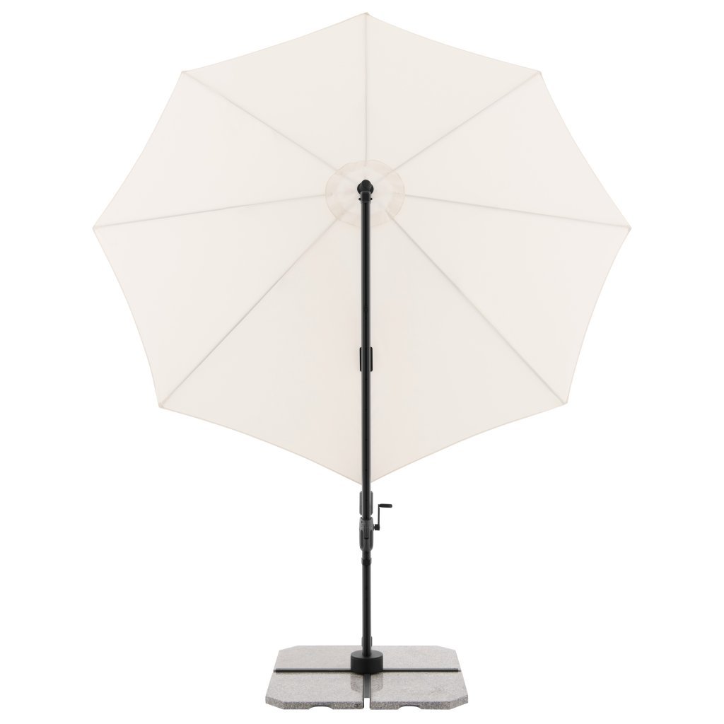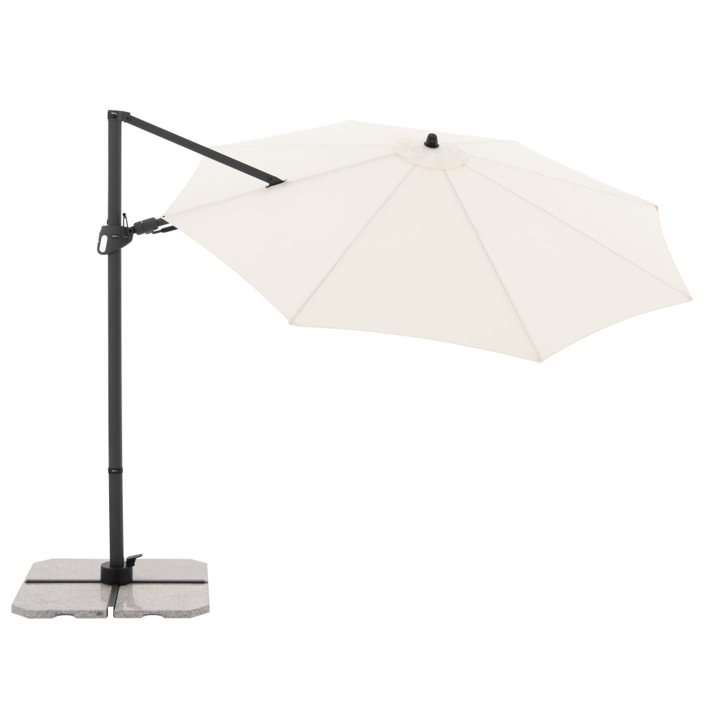 Parasol ma stabilną aluminiową konstrukcję, wyposażony jest w mechanizm korbowy i jest łatwy w obsłudze. Pokrycie parasola wykonane jest z tkaniny poliestrowej, jest wodoodporne i posiada dobrą ochronę UV SPF 50+. Parasol obraca się o 360°, można go pochylać w siedmiu pozycjach i obracać osiowo w obie strony.