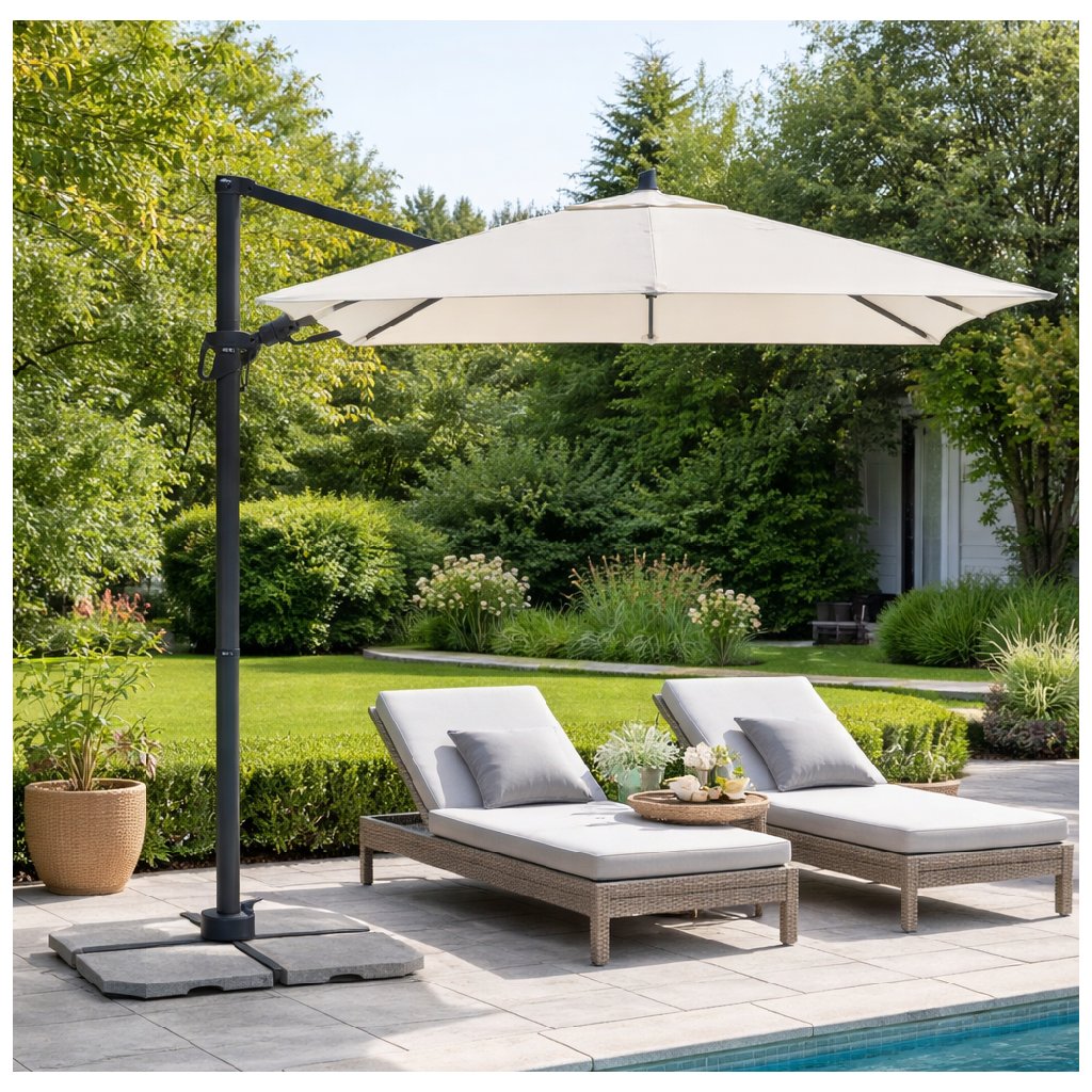 Parasol ma stabilną aluminiową konstrukcję, wyposażony jest w mechanizm korbowy i jest łatwy w obsłudze. Pokrycie parasola wykonane jest z tkaniny poliestrowej, jest wodoodporne i posiada dobrą ochronę UV SPF 50+. Parasol obraca się o 360°, można go pochylać w siedmiu pozycjach i obracać osiowo w obie strony.