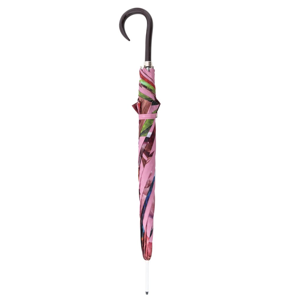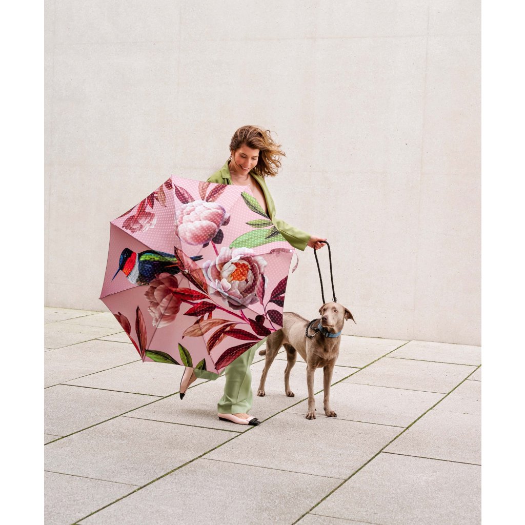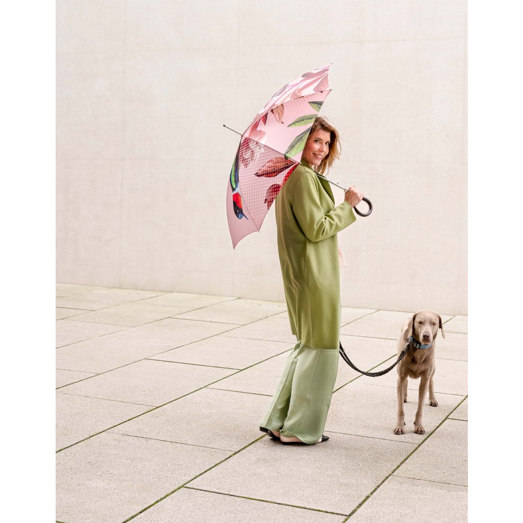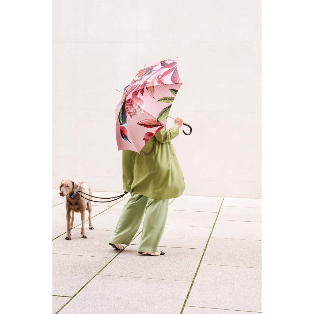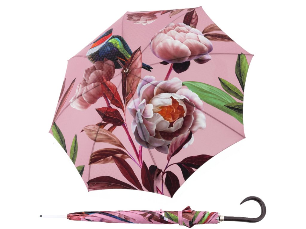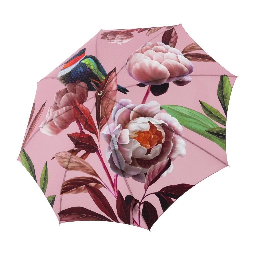 Ekskluzywny luksusowy damski parasol automatyczny typu laska z serii manufaktur boheme splendid marki doppler, ręcznie wykonany w Austrii. Ten parasol o wyrazistym motywie z pewnością zachwyci każdego swoim magicznym, kwiatowym nadrukiem. Staroróżowy kolor czaszy parasola doskonale komponuje się z motywem kwitnących piwonii, które są jednocześnie eleganckie i harmonijne. Wyraziste są połączenia kolorystyczne z zielonymi liśćmi i kolibrem.