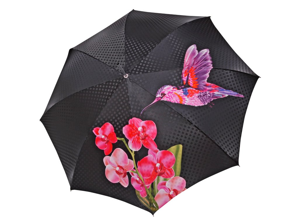 Nadruk na parasolu z wyrazistym motywem kolibra i egzotycznych kwiatów przyciągnie Twoją uwagę od pierwszego wejrzenia. Skórzana, ręcznie szyta rączka.
