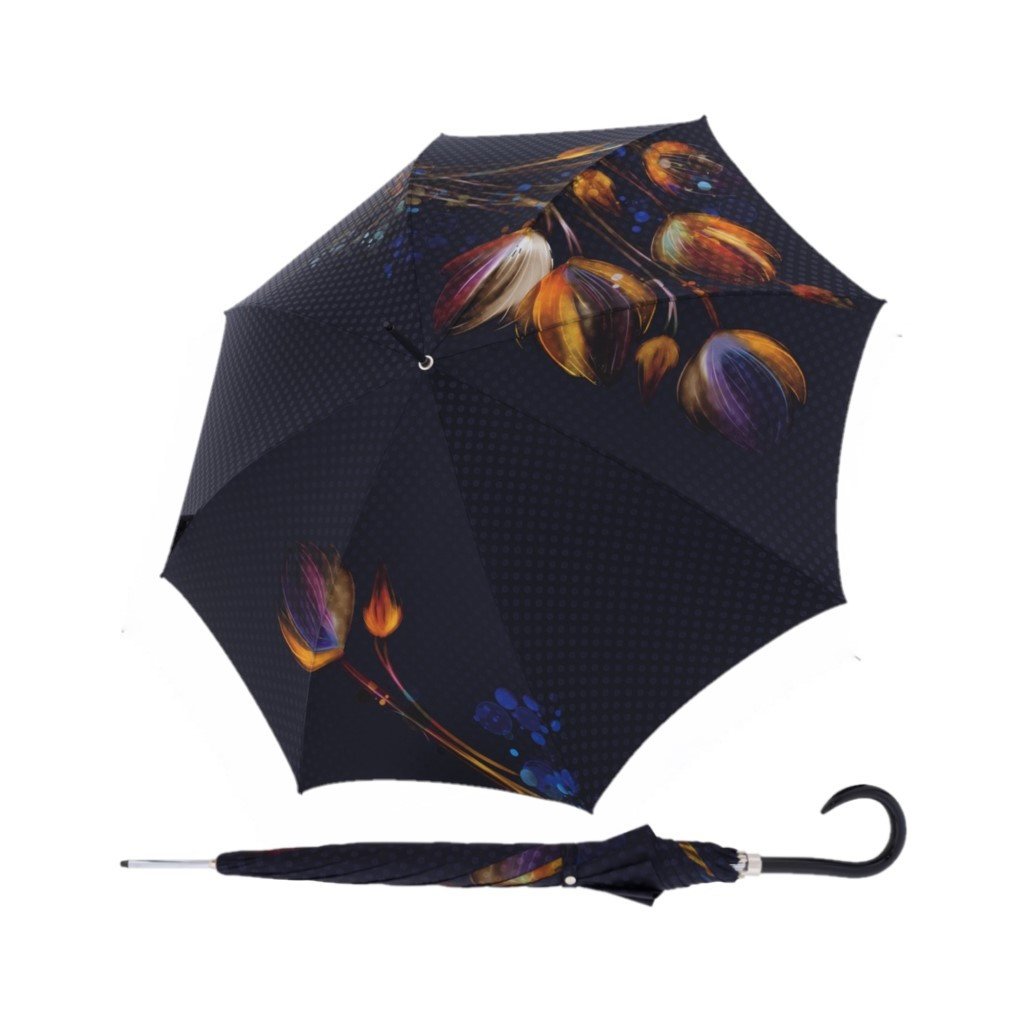 Elegancki parasol z serii Boheme marki Doppler Manufaktur zachwyca połączeniem ciemnego tła z abstrakcyjnym, kwiatowym nadrukiem w żywych kolorach.Połączenie kolorystyczne sugeruje wiosnę i jesień i z pewnością przyciągnie podziwiające spojrzenia.