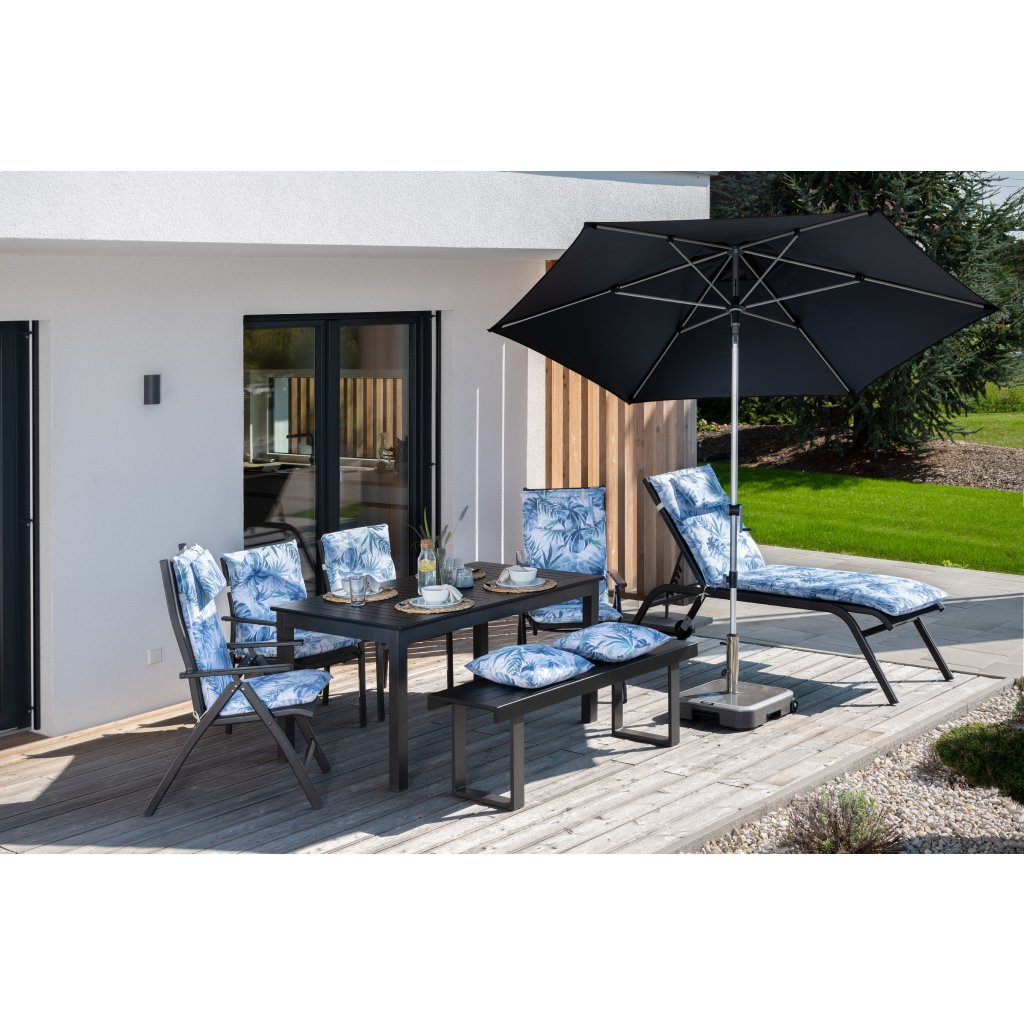Leżak ogrodowy EXPERT w eleganckim antracytowym kolorze łączy komfortową konstrukcję z wysoką praktycznością. Rama wykonana z lekkiego aluminium gwarantuje odporność na warunki atmosferyczne i łatwość obsługi. Wytrzymała tkanina jest odporna na blaknięcie i nie wymaga konserwacji – idealna do użytku na zewnątrz.