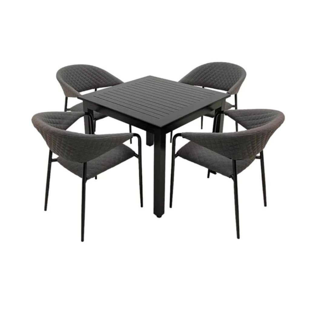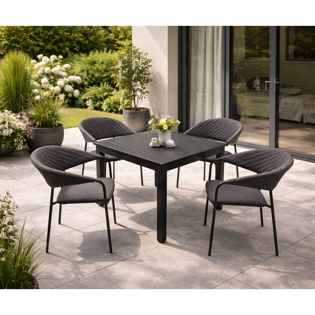 Praktyczny i nowoczesny stół ogrodowy o kwadratowym kształcie. Proste i czyste linie stołu pasują do każdego otoczenia. Cały stół wykonany jest z wysokiej jakości stopu aluminium w kolorze antracytowym. Blat stołu jest żebrowany. Na nogach znajdują się kółka regulacyjne do ewentualnego wyrównania nierówności podłoża.