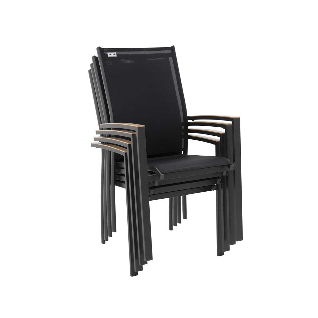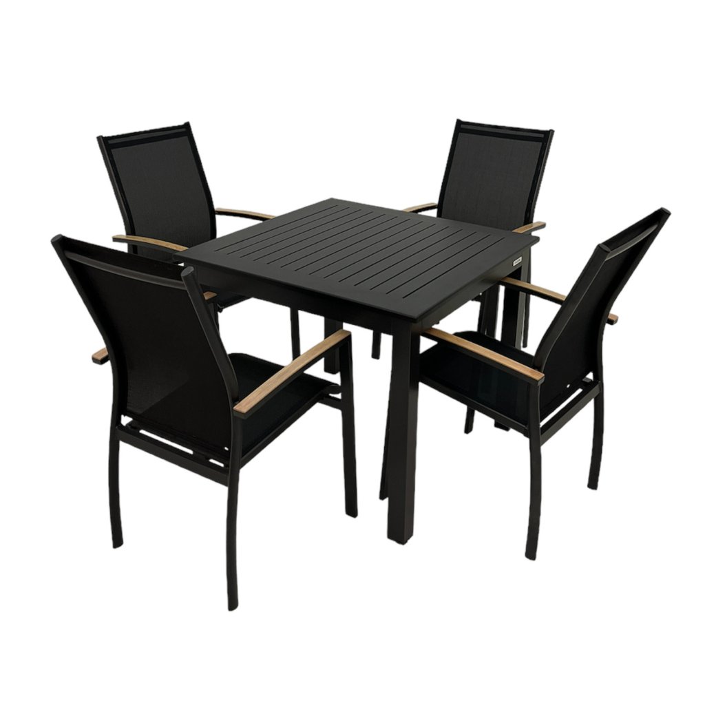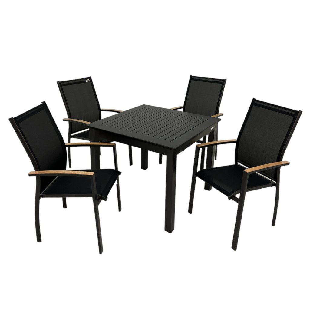 Nowoczesny aluminiowy zestaw wypoczynkowy EXPERT WOOD antracyt 4+1 jest idealny dla każdego, kto chce przekształcić swój ogród lub taras w strefę wypoczynku i relaksu. Zestaw jest atrakcyjny wizualnie dzięki proszkowemu wykończeniu w dekorze drewna, które zostało zastosowane na podłokietnikach wszystkich krzeseł. Zestaw zawiera 4 sztuki sztaplowanych krzeseł z aluminiową konstrukcją i antracytowym wykończeniem. Krzesła można sztaplować jedno na drugim, aby zaoszczędzić miejsce.