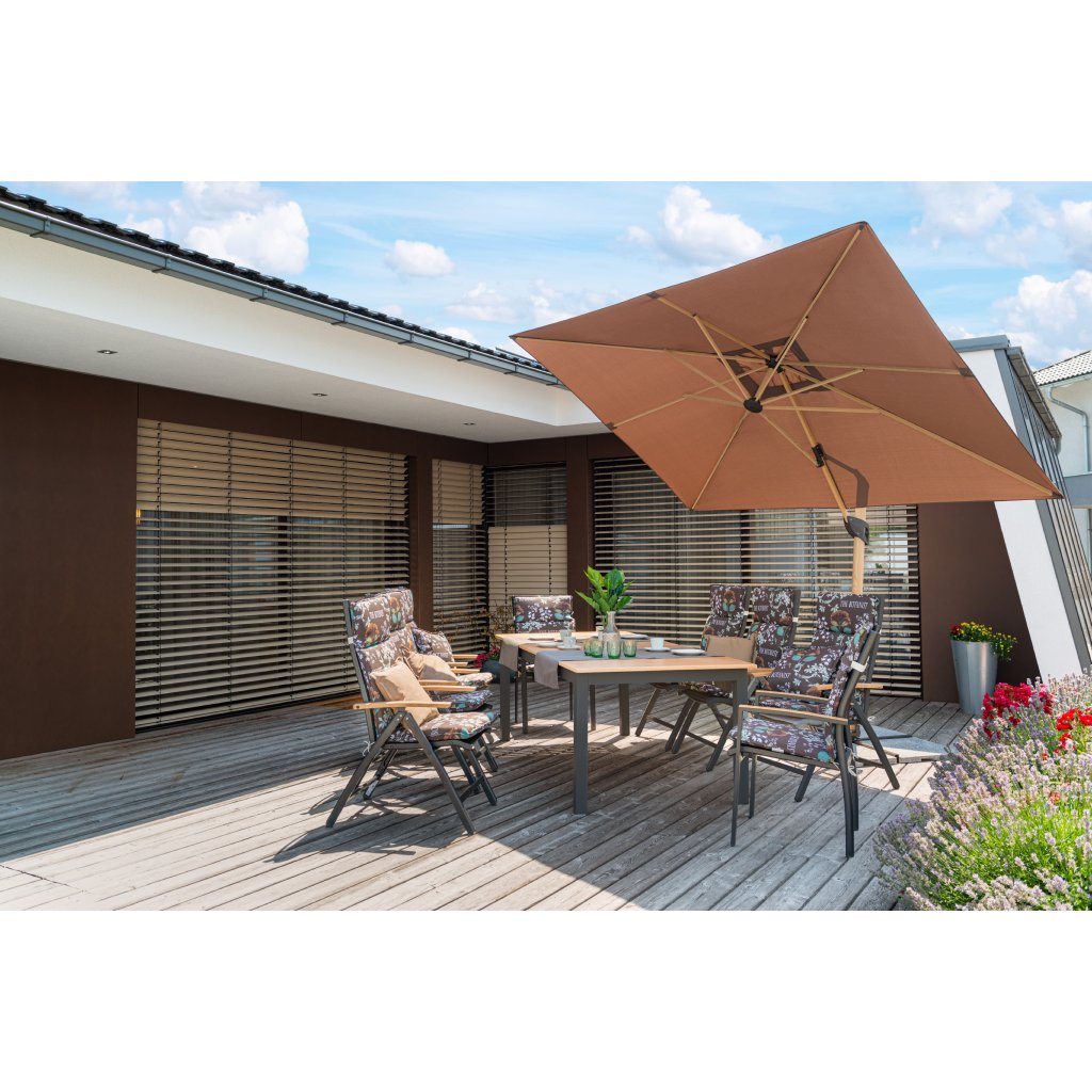 Rozkładany stół EXPERT WOOD posiada wytrzymałą aluminiową konstrukcję w kolorze antracytowym. Żebrowany aluminiowy blat stołu ma proszkowy lakier w dekorze drewna. Dzięki temu stół jest lekki, bezobsługowy i odporny na warunki atmosferyczne. Staje się meblem ogrodowym o długiej żywotności.