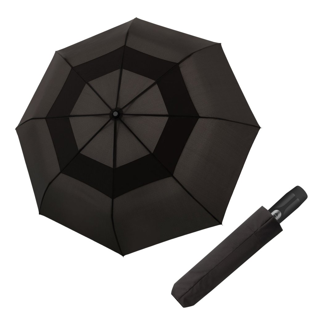 Męski, w pełni automatyczny parasol. Szkielet parasola wykonany jest z połączenia włókna szklanego i stali, co gwarantuje wytrzymałość i stabilność.