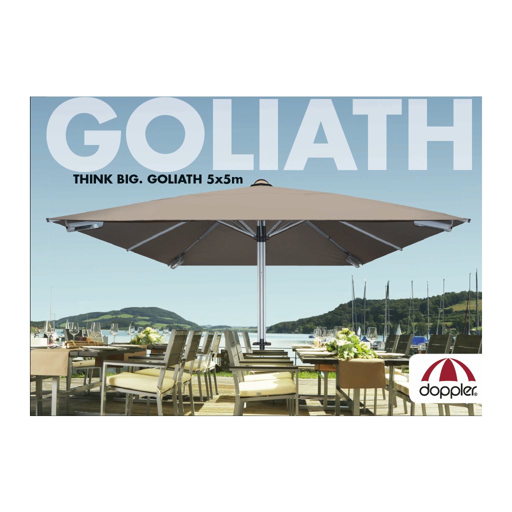 Goliath to potwór wśród parasoli gastronomicznych Doppler. Powierzchnia parasola 25 m2 gwarantuje wystarczającą ochronę przed słońcem i deszczem. Dzięki innowacyjnej technologii i wysokiej jakości użytych materiałów możesz go obsługiwać łatwo i wygodnie. Masz do wyboru szeroką gamę kolorów pokrowców i akcesoriów.