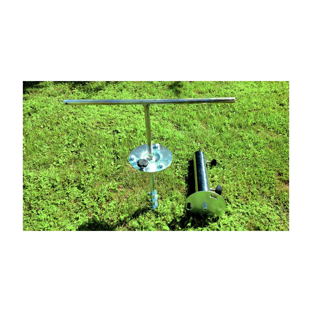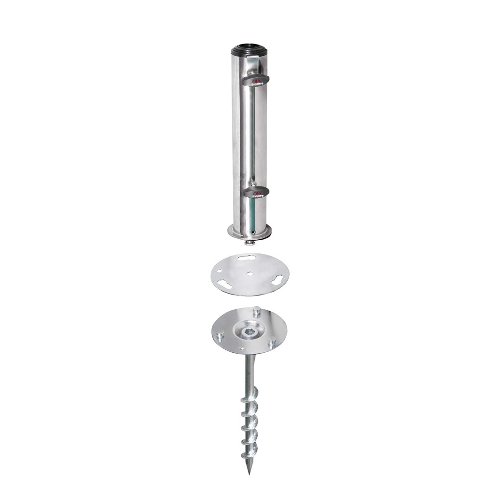 Łatwe w użyciu - obracaj kotwę gruntową pionowo w ziemię za pomocą klucza do wkręcania, umieść stojak na kotwie gruntowej (gwint), dokręć i zabezpiecz śrubą. Następnie możesz wsunąć maszt parasola do stojaka i zamocować dwie śruby mocujące.