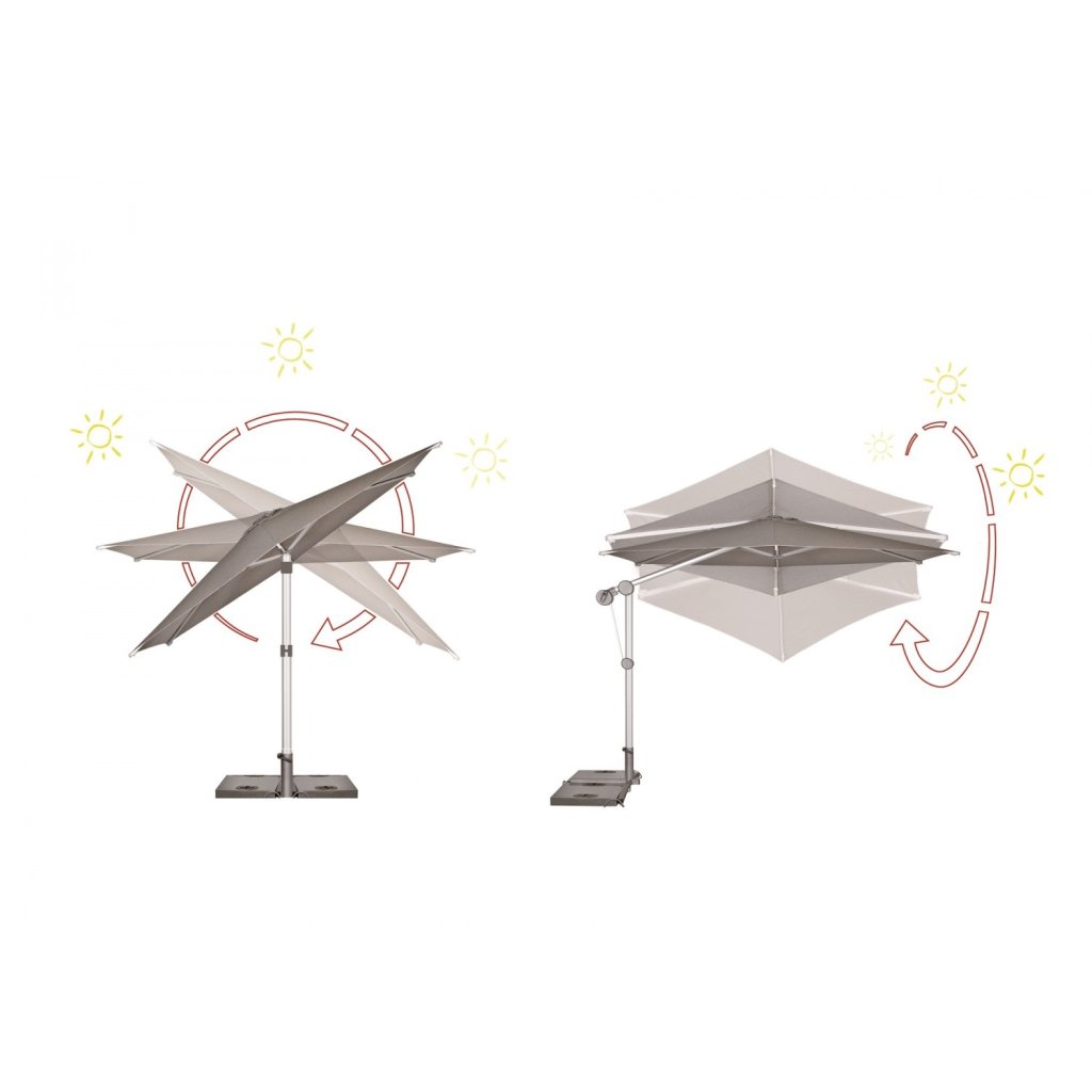 Protect 400P to wielofunkcyjny parasol z boczną nogą, który niezawodnie zacieni Twoje miejsce do siedzenia w ogrodzie. Parasol ma łatwą obsługę za pomocą korby, obraca się o 360° i można go przechylać w obu kierunkach, dzięki czemu można go idealnie dopasować do ruchu słońca. Konstrukcja wykonana jest z wysokiej jakości aluminium. Dostarczamy wraz z pokrowcem ochronnym.