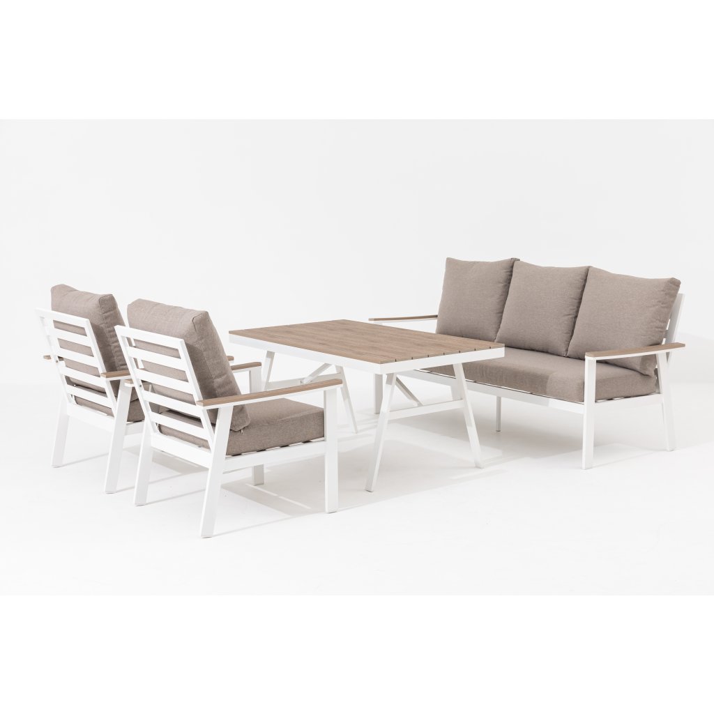 Biała aluminiowa konstrukcja wygląda elegancko i jest uzupełniona szaro-brązowymi poduszkami i elementami w drewnianym dekorze, które nadają całemu zestawowi ciepły i naturalny wygląd. W zestawie znajdują się również wygodne siedziska i oparcia, które zapewniają maksymalny komfort.