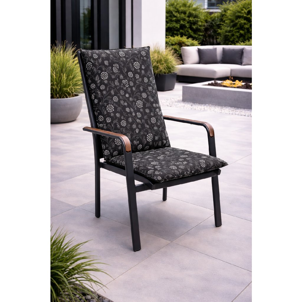 Materac z niskim oparciem do mebli ogrodowych z serii LIVING jest wykonany z obszytym brzegiem, pikowany okręgowo 2x w oparciu. Mocowanie odbywa się za pomocą przesuwnego klipsa. Dzięki klipsowi można regulować rozmiar w zależności od wymiaru i rodzaju krzesła, klips jest mocny i się nie rozciąga. Mocowanie siedziska odbywa się za pomocą dwóch sznurków w zgięciu materaca. Grubość materaca jest optymalna dla wszystkich rodzajów krzeseł. Wykonanie nadaje się również do trudnych warunków kawiarni, ogródków i restauracji. Pokrowiec jest nieściągalny.