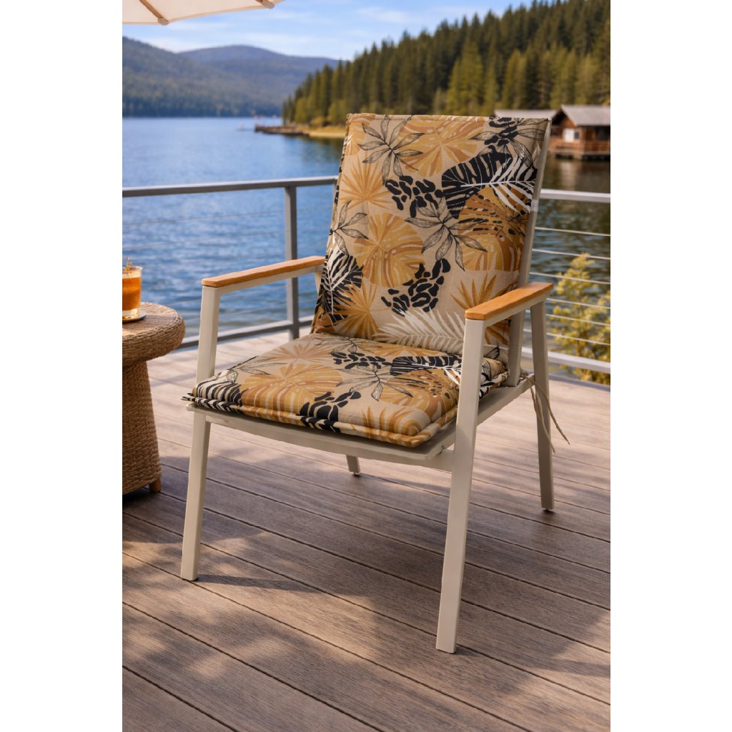 Poduszka z niskim oparciem z serii LIVING jest w wykonaniu z obszytym brzegiem, pikowana pierścieniowo 2x w oparciu. Mocowanie odbywa się za pomocą przesuwnego klipsa. Dzięki klipsowi można dopasować rozmiar do wymiarów i rodzaju krzesła, klips jest mocny i się nie rozciąga. Mocowanie siedziska odbywa się za pomocą dwóch sznurków w zgięciu poduszki. Grubość poduszki jest optymalna dla wszystkich rodzajów krzeseł. Wersja nadaje się również do trudnych warunków kawiarni, ogródków i restauracji. Pokrowiec jest nieściągalny.