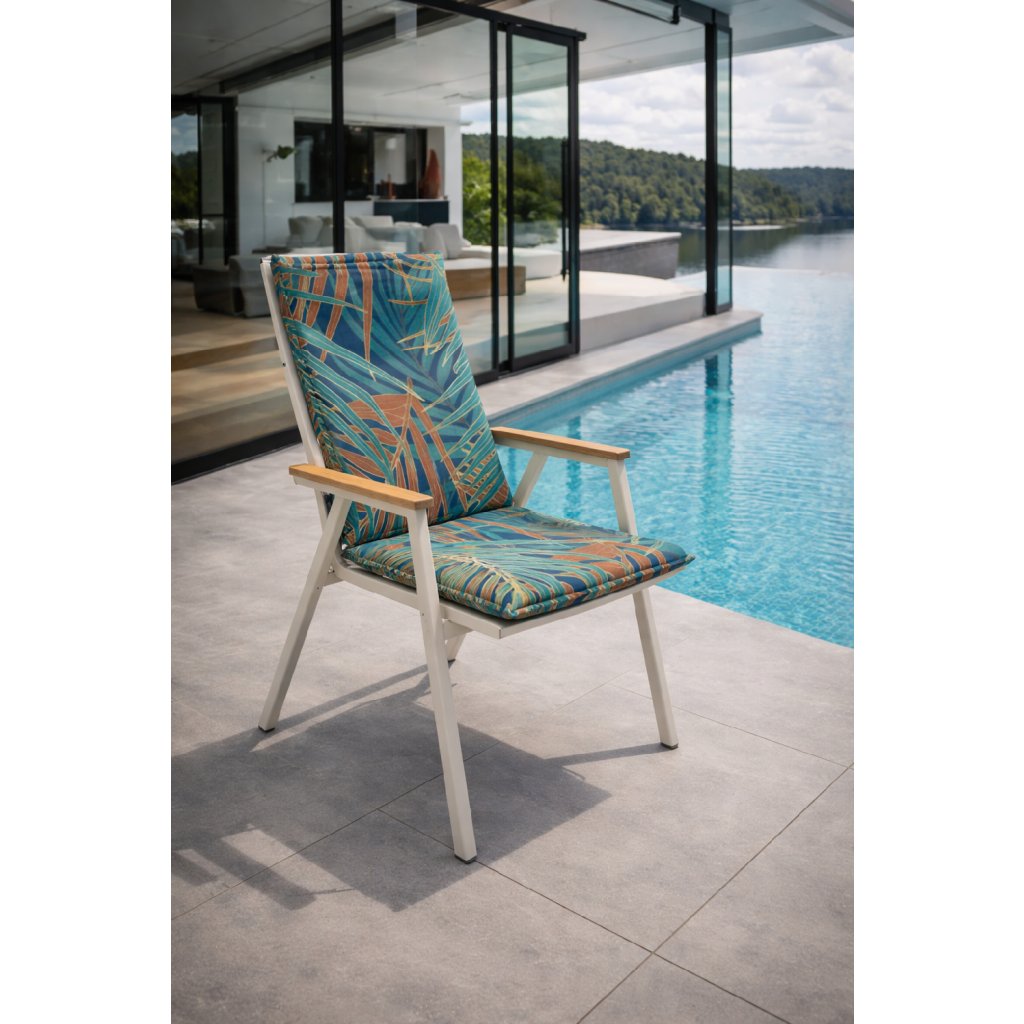Poduszka z niskim oparciem z serii LIVING jest w wykonaniu z obszytym brzegiem, pikowana pierścieniowo 2x w oparciu. Mocowanie odbywa się za pomocą przesuwnego klipsa. Dzięki klipsowi można dopasować rozmiar do wymiarów i rodzaju krzesła, klips jest mocny i się nie rozciąga. Mocowanie siedziska odbywa się za pomocą dwóch sznurków w zgięciu poduszki. Grubość poduszki jest optymalna dla wszystkich rodzajów krzeseł. Wersja nadaje się również do trudnych warunków kawiarni, ogródków i restauracji. Pokrowiec jest nieściągalny.