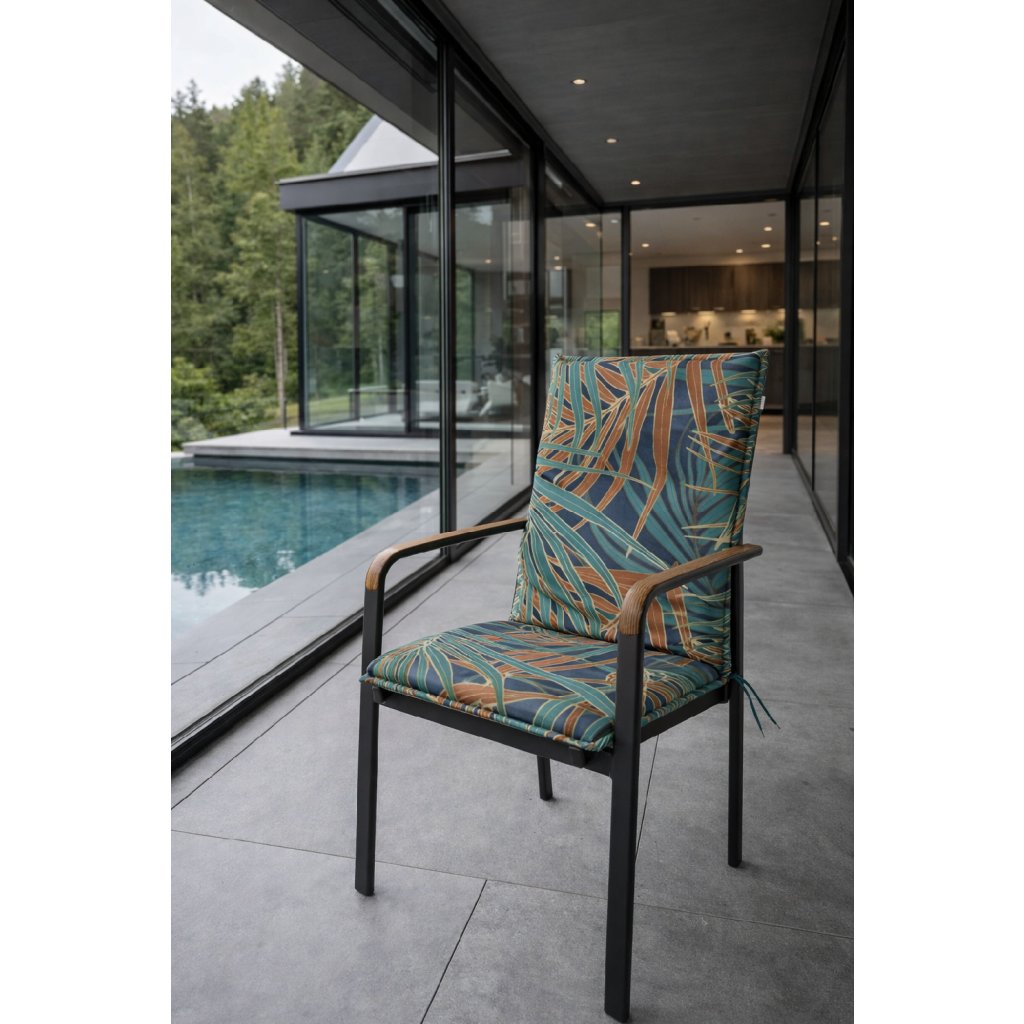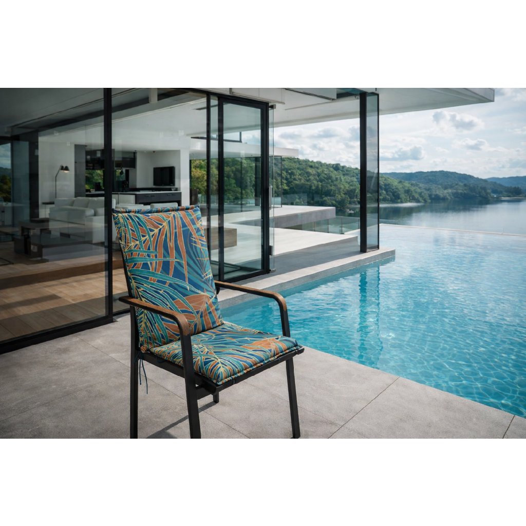 Poduszka ze średnim oparciem z serii LIVING jest w wersji z obszytym brzegiem, pikowana pierścieniowo 2x w oparciu. Mocowanie odbywa się za pomocą przesuwnego klipsa. Dzięki klipsowi można dostosować rozmiar do wymiarów i rodzaju krzesła, klips jest mocny i się nie rozciąga. Mocowanie siedziska odbywa się za pomocą dwóch sznurków w zgięciu poduszki. Grubość poduszki jest optymalna dla wszystkich rodzajów krzeseł. Wersja jest odpowiednia nawet do trudnych warunków kawiarni, ogródków i restauracji. Pokrowiec jest nieusuwalny.