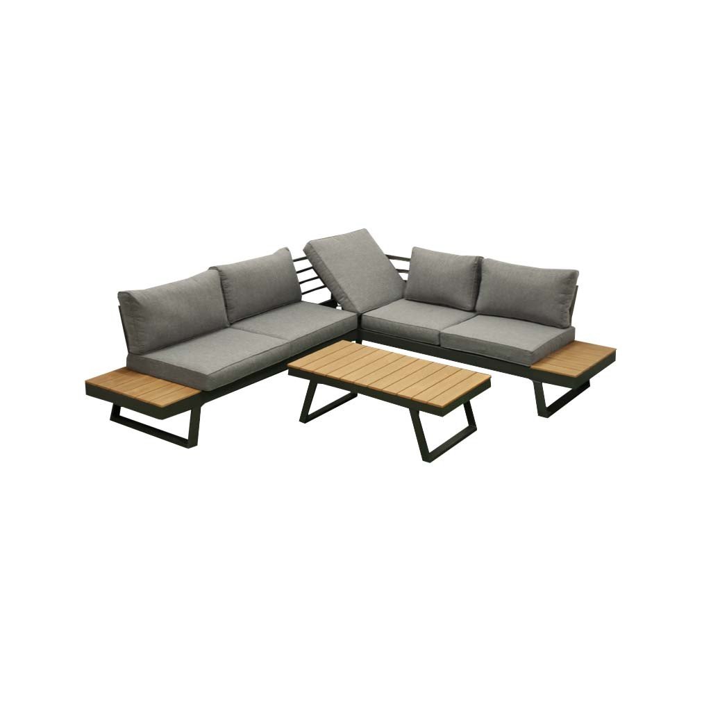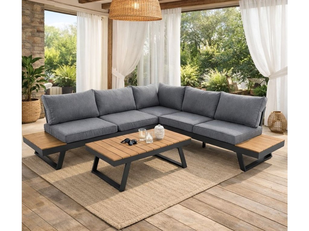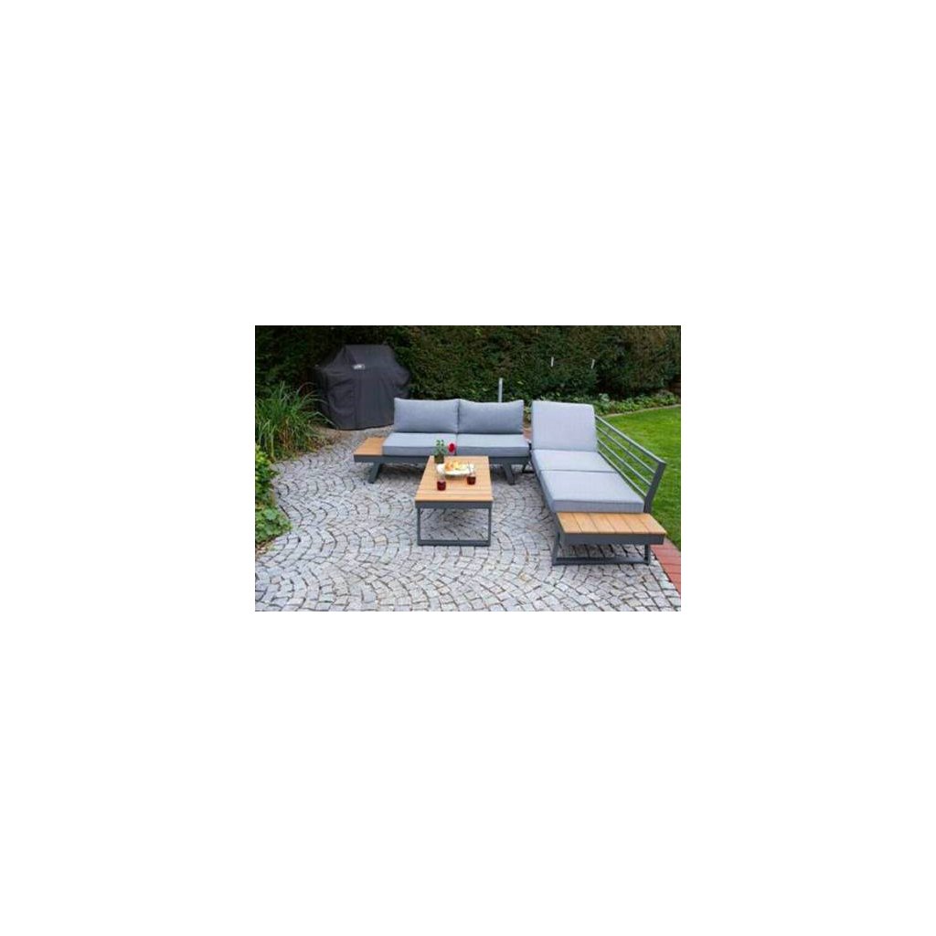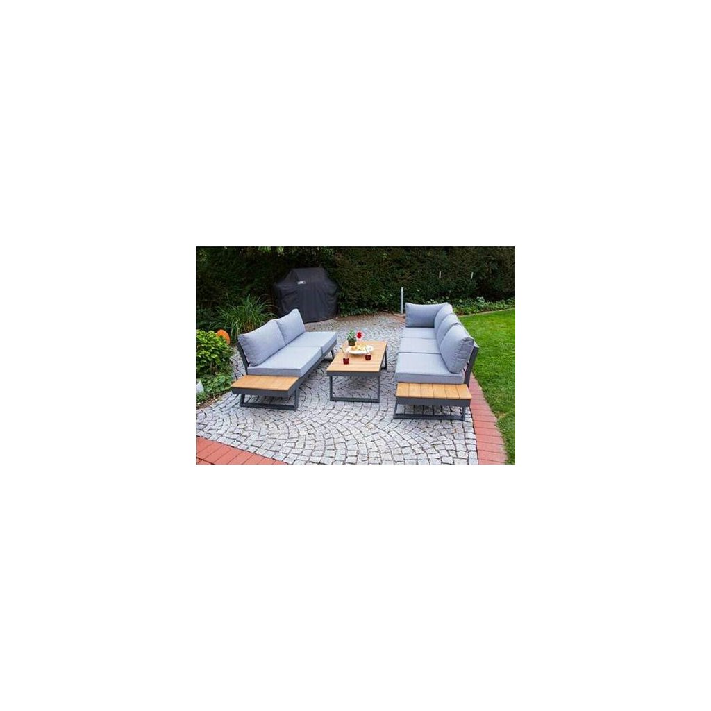Składa się z narożnej sofy zakończonej praktycznymi schowkami i prostokątnego stolika. Sofa może być dodatkowo regulowana z jednej strony w 5 różnych pozycjach, tworząc wygodniejszą wersję leżaka ogrodowego. O maksymalną wygodę zadbają wygodne poduszki siedziska i oparcia w kolorze ciemnoszarym. Wszystkie tapicerki wykonano z materiałów odpowiednich do użytku zewnętrznego i wyposażono w zamki, dzięki czemu nie ma problemu z wypraniem pokrowców po wyjęciu wypełnienia.