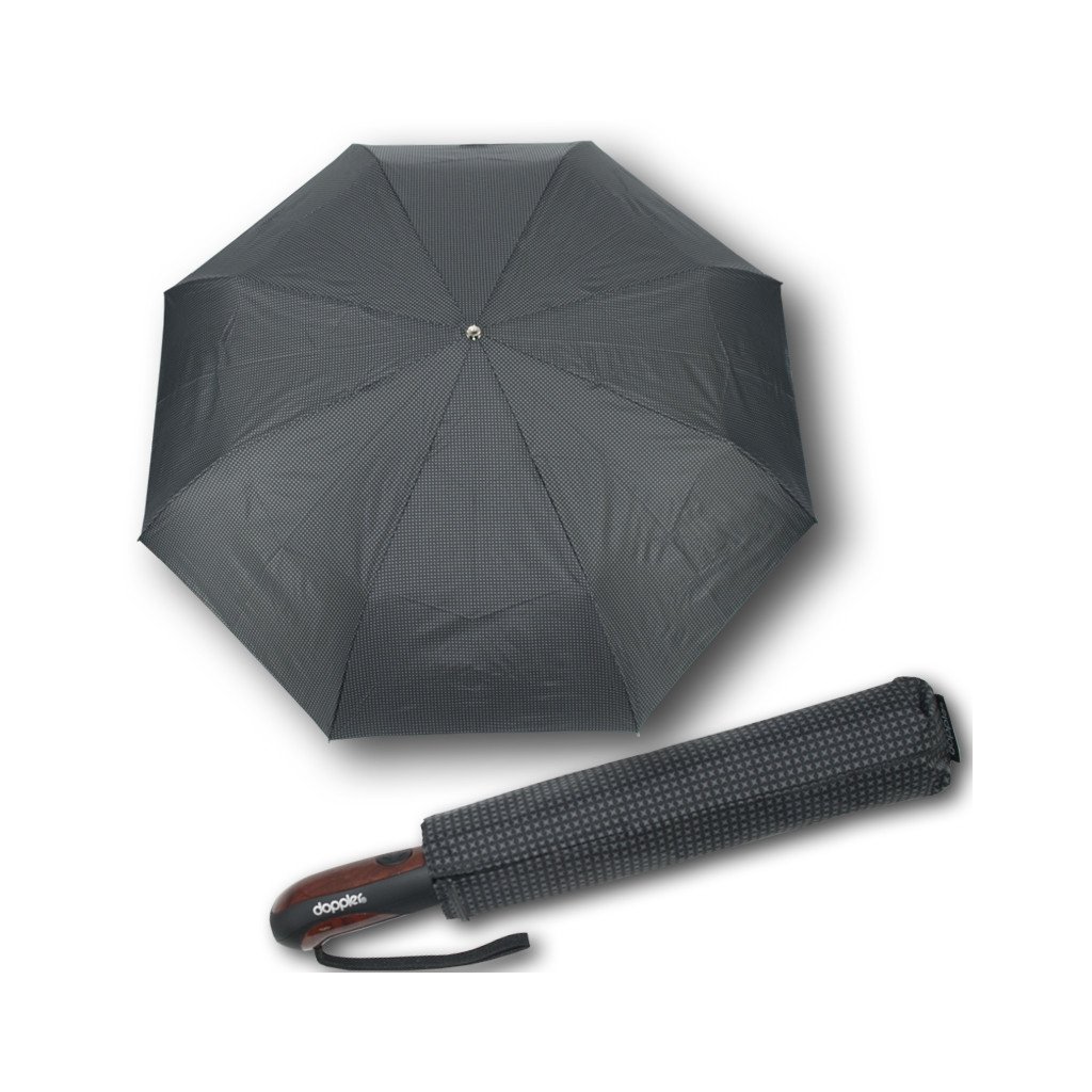 Partnerski w pełni automatyczny składany parasol. Czarny pokrowiec w szare paski. Bardzo wysokiej jakości konstrukcja wykonana ze szkła, stali i włókna węglowego. Dwa ostatnie segmenty wykonane z włókna szklanego, co zapobiega uszkodzeniu parasola podczas wiatru i ułatwia jego powrót do pierwotnej pozycji. Duży dach i praktyczne etui na zamek błyskawiczny. Poliestrowa poszycie jest odporne na zmiany wilgotności i temperatury, nie kurczy się.