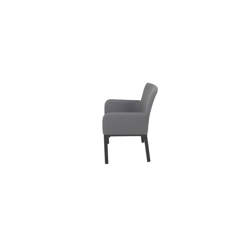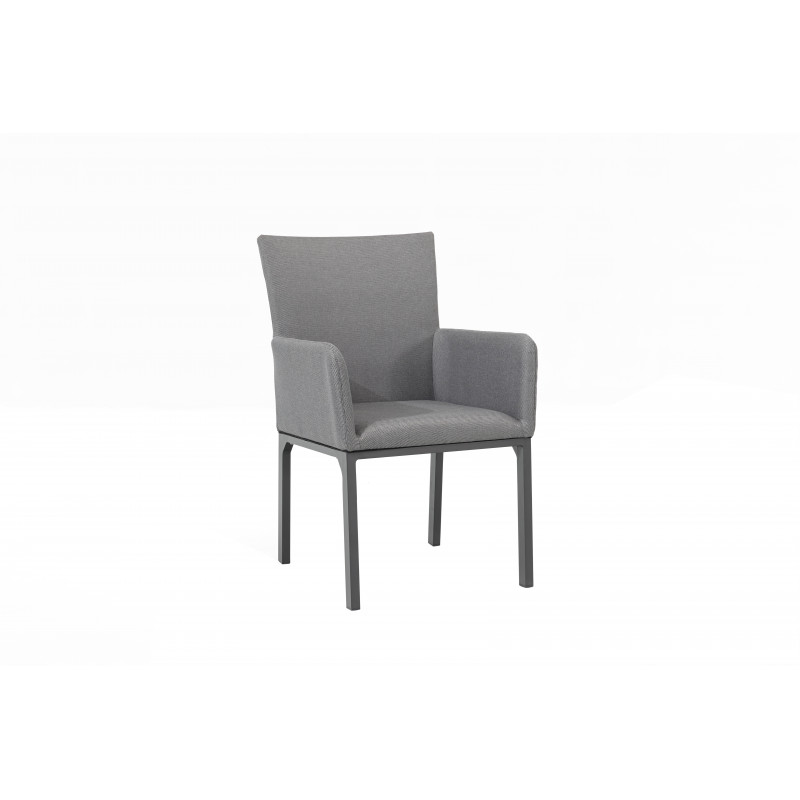Krzesło Tombolo o stabilnej aluminiowej konstrukcji w kolorze antracytowym. Nowoczesny fotel tapicerowany wykonany z tkaniny Olefin w kolorze szarym jest tegoroczną nowością i poszerza ofertę w pełni tapicerowanych krzeseł do jadalni wykonanych z trwałych materiałów. Materiał Olefin to tkanina syntetyczna o doskonałych właściwościach do użytku na zewnątrz, odpowiednia do ciężkich zastosowań. Fotel jest wypełniony szybkoschnącą pianką.