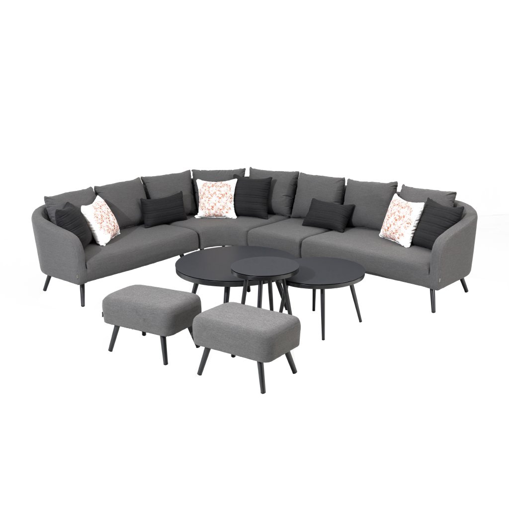 Luksusowy zestaw ogrodowy, który może być na zewnątrz przez cały rok. Podczas relaksu poczujesz się jak w salonie, jednocześnie ciesząc się świeżym powietrzem. Zestaw składa się z narożnej sofy, dwóch puf i trzech stolików. Cały zestaw zawiera również 8 poduszek dekoracyjnych. Jest bardzo zmienny, można go obracać lub rozszerzać. Konstrukcja wykonana jest z lekkiego, wytrzymałego i bezobsługowego aluminium. Tapicerka całego zestawu wykonana jest z tkaniny LIKA-TEX, wypełnienie z szybkoschnącej pianki, co gwarantuje szybkie schnięcie po deszczu i zestaw może pozostać cały sezon na zewnątrz. W zestawie znajdują się puszyste szare poduszki, pokrowce są zdejmowane (można je prać) i wykonane z wysokiej jakości tkaniny LIKA-TEX®. Blaty stołów wykonane są z 5-milimetrowego szkła z powłoką kamionkową.