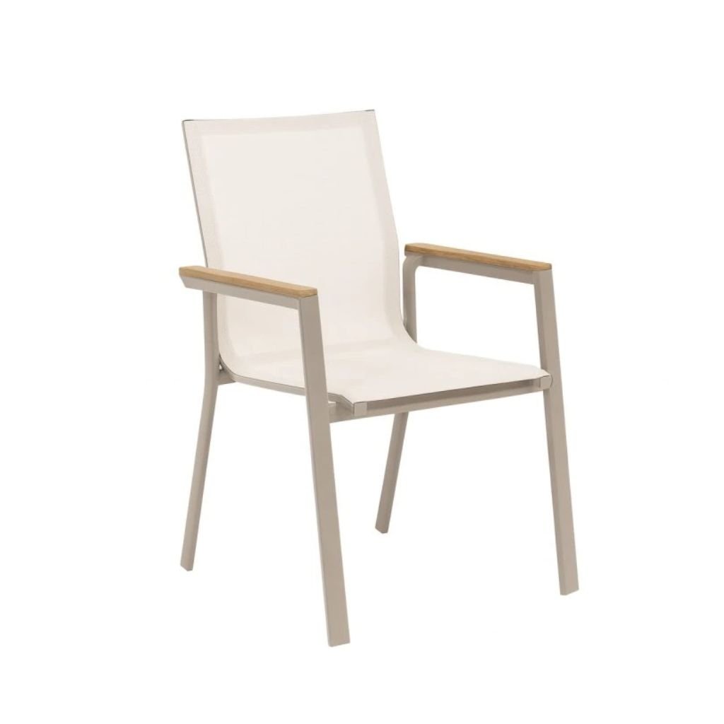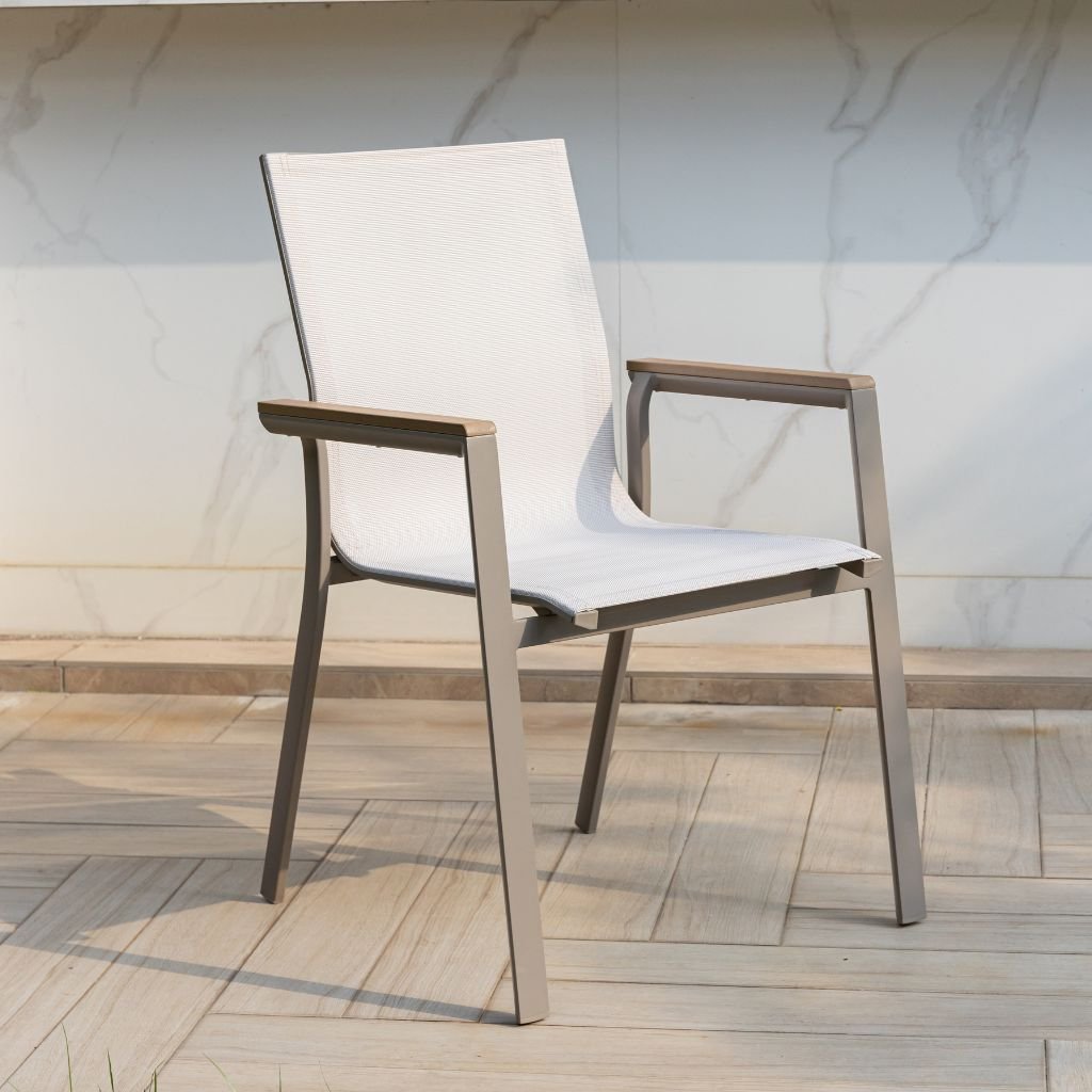 Stylowe krzesło sztaplowane Meran łączy nowoczesne wzornictwo z naturalnymi tonami. Konstrukcja z aluminium zapewnia wytrzymałość i długowieczność, podczas gdy podłokietniki w dekorze drewna tekowego nadają elegancki wygląd.