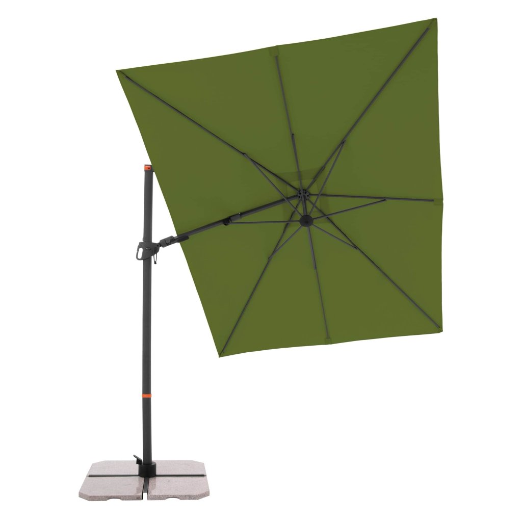 Dzięki prostokątnemu daszkowi parasol jest szczególnie odpowiedni do zacieniania mebli ogrodowych. Parasol można również obracać o 360 stopni, swobodnie obracać w obie strony i pochylać do tyłu w siedmiu pozycjach.