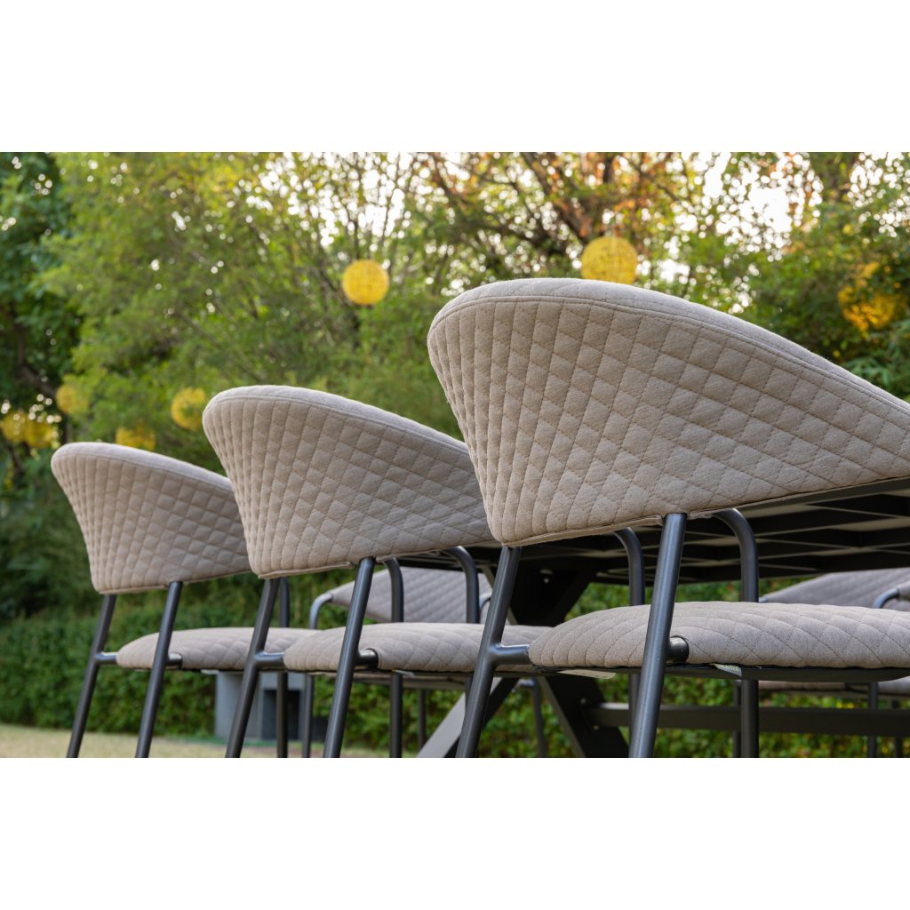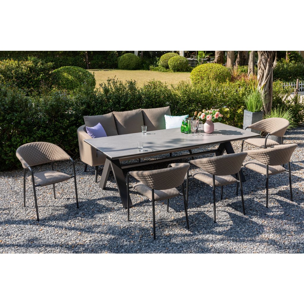 Sześć krzeseł Melia LIKA-TEX® nadaje temu zestawowi nie tylko komfort, ale także nowoczesny styl. Konstrukcja z lekkiego, ale stabilnego aluminium w kolorze antracytowym jest odporna na warunki atmosferyczne i łatwa do przenoszenia. Komfortowe tapicerowanie z ozdobnym pikowaniem wykonane jest z najwyższej jakości tkaniny LIKA-TEX®, która jest odporna na wilgoć, promieniowanie UV i szybko schnie. Wypełnienie z szybkoschnącej pianki gwarantuje, że krzesła można pozostawić na zewnątrz przez cały rok bez utraty jakości.