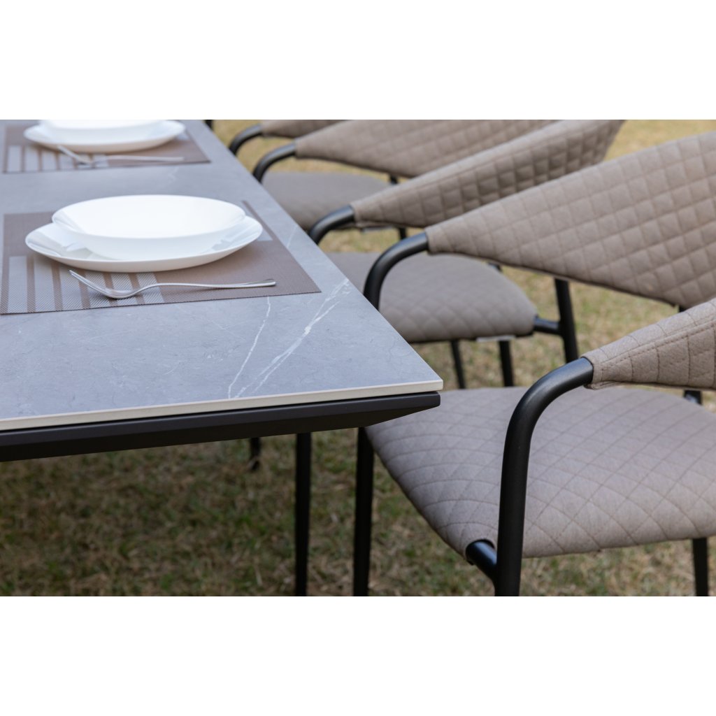 Stół Nova wyróżnia się minimalistycznym designem i zastosowaniem wysokiej jakości materiałów. Jego solidna aluminiowa konstrukcja w kolorze antracytowym zapewnia stabilność i długowieczność, podczas gdy blat ze spiekanego kamienia nadaje stołowi luksusowy wygląd i wyjątkowe właściwości. Ten innowacyjny materiał charakteryzuje się wysoką odpornością na zarysowania, plamy i warunki atmosferyczne. Nieporowata powierzchnia blatu jest łatwa w utrzymaniu, dzięki czemu stół jest łatwy do czyszczenia i zawsze wygląda jak nowy. Dzięki regulatorom na nogach stół można wypoziomować nawet na nierównym podłożu, co zapewnia jego doskonałą stabilność.