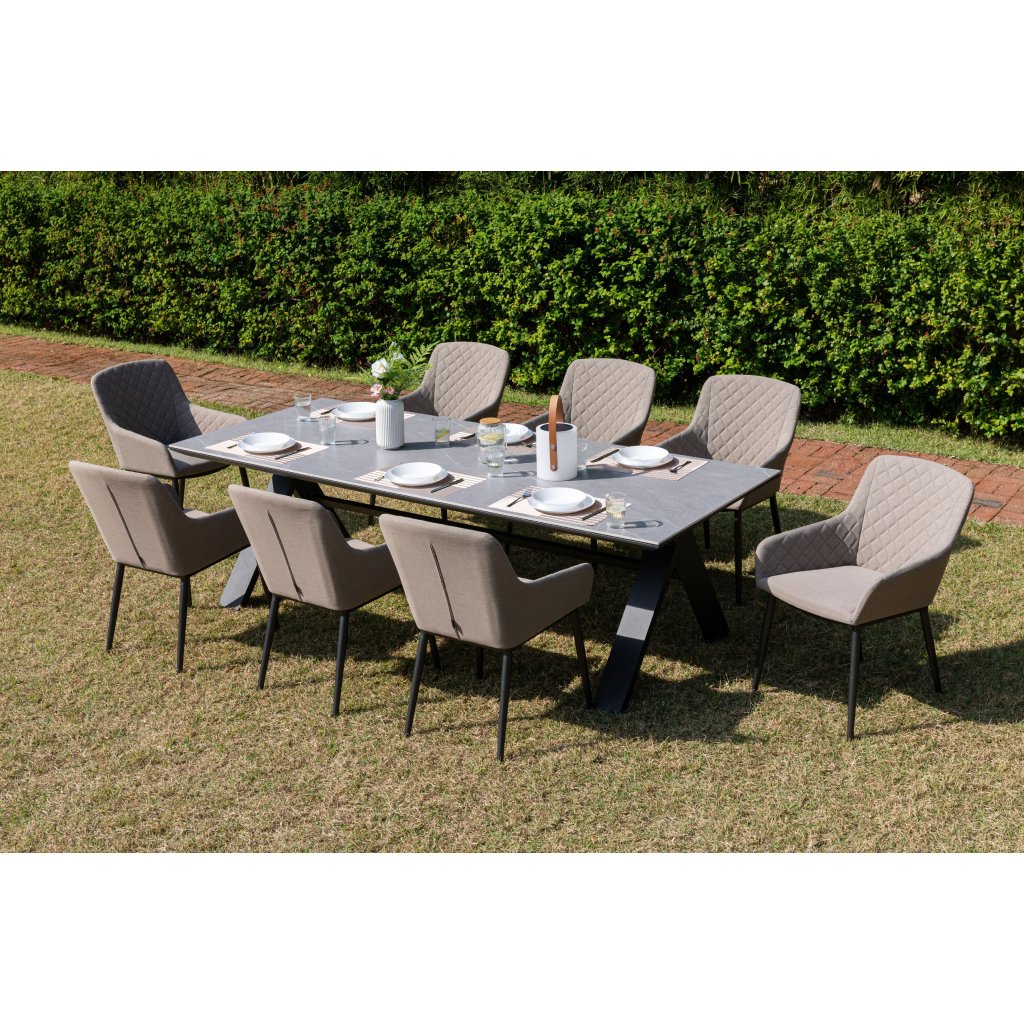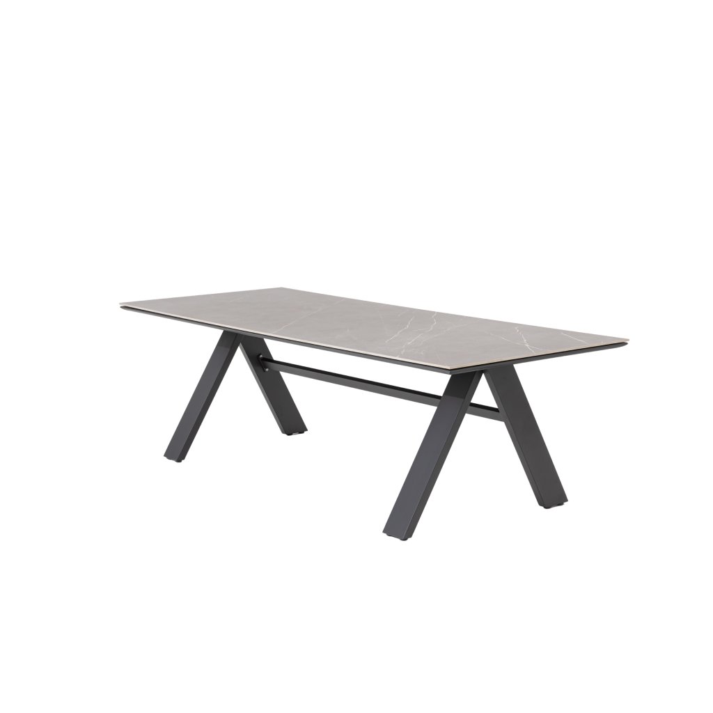 Stół Nova zachwyca minimalistycznym designem i wykorzystaniem materiałów najwyższej jakości. Jego solidna aluminiowa konstrukcja w eleganckim kolorze antracytowym zapewnia stabilność i długą żywotność, podczas gdy blat ze spiekanego kamienia nadaje stołowi luksusowy wygląd i unikalne właściwości.