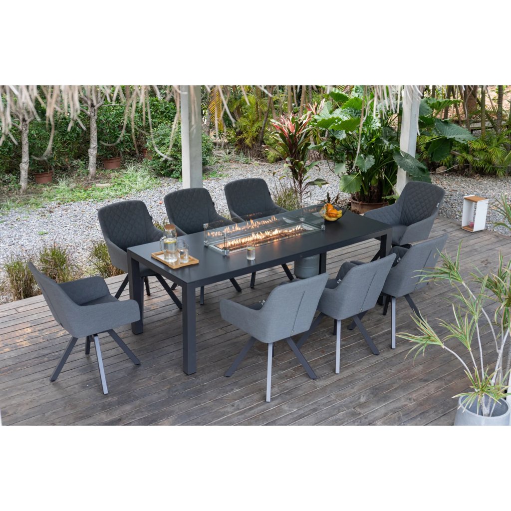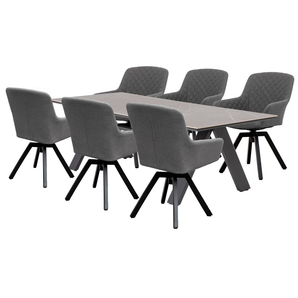 Do eleganckiego stołu dołączono sześć obrotowych krzeseł Paris LIKA-TEX®, które gwarantują nie tylko styl, ale także maksymalny komfort. Te designerskie fotele posiadają stabilną, ale lekką aluminiową konstrukcję w nowoczesnym kolorze antracytowym. Wyjątkowy komfort zapewnia miękkie obicie z ozdobnym pikowaniem, wykonane z najwyższej jakości tkaniny LIKA-TEX®. Materiał ten jest odporny na wilgoć, warunki atmosferyczne i promieniowanie UV, co pozwala na pozostawienie krzeseł na zewnątrz przez cały rok bez obawy o ich uszkodzenie. Dzięki mechanizmowi obrotowemu z obrotem o 360° fotel jest bardzo praktyczny i wygodny, zarówno podczas siedzenia przy stole, jak i podczas relaksu z widokiem na ogród.