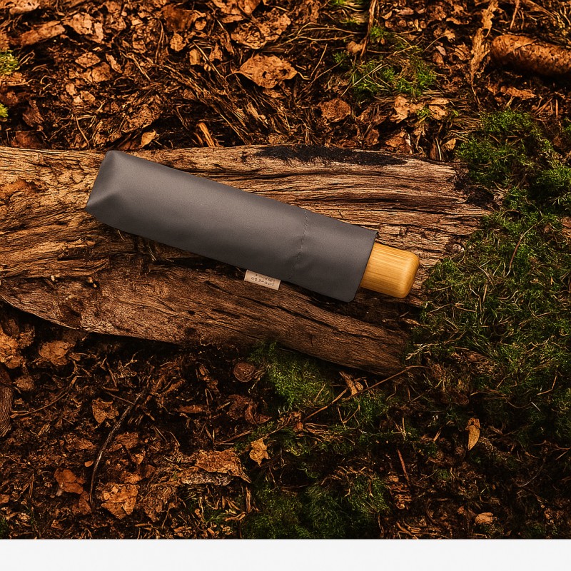 Składany parasol wykonany z materiałów przyjaznych dla środowiska.