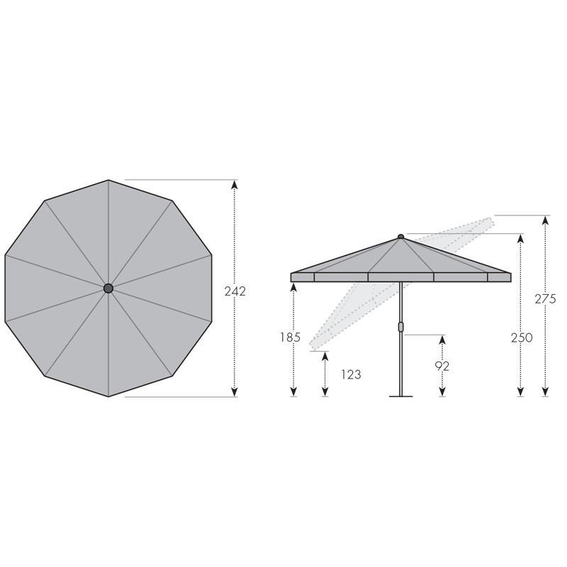 Ten parasol jest idealnym towarzyszem na balkon lub taras. Rama parasola wykonana jest ze stali w kolorze antracytowym z powłoką epoksydową. Parasol umożliwia wygodne odch ylanie dachu. Czasza parasola wykonany jest z wysokiej jakości wodoodpornego materiału poliestrowego bez szwów, który jest odporny na warunki atmosferyczne i zapewnia dobrą ochronę przed promieniowaniem UV 50+. Nadaje się do obiektów gastronomicznych.