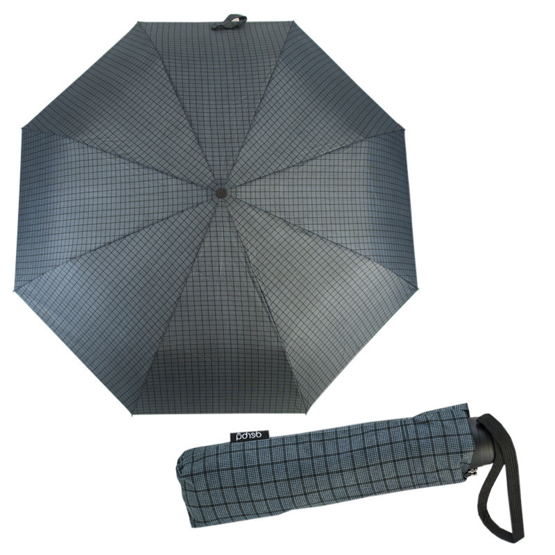 Męski składany parasol wysokiej jakości. Czarna stalowa rama parasola gwarantuje wytrzymałość i stabilność. Odporny na korozję. Poliestrowe poszycie jest odporne na zmiany wilgotności i temperatury, nie kurczy się.